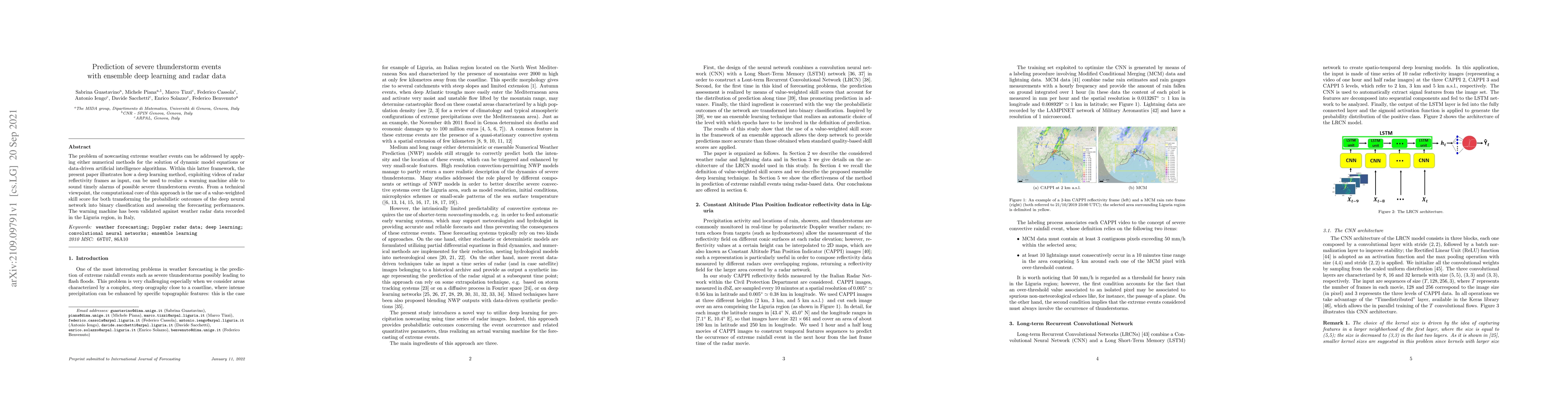 This paper proposes a deep learning method using radar reflectivity data to predict severe thunderstorm events, employing a value-weighted skill score for probabilistic outcomes and binary classification. The approach was validated using radar data from the Liguria region in Italy.