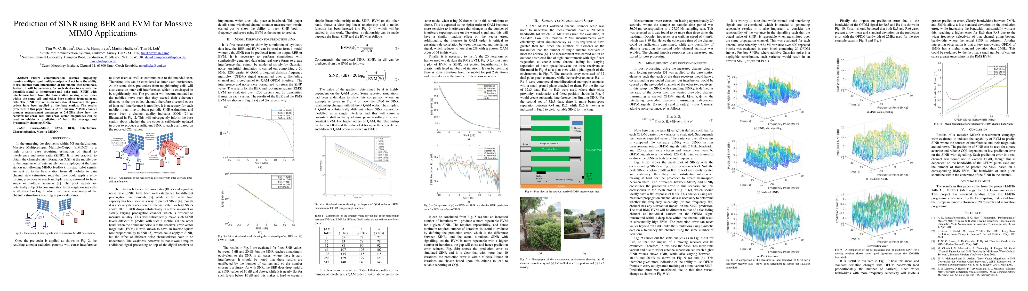 Future communication systems employing massive multiple input multiple output will not have the ability to use channel state information at the mobile user terminals. Instead, it will be necessary for such devices to evaluate the downlink signal to interference and noise ratio (SINR) with interference both from the base station serving other users within the same cell and other base stations from adjacent cells. The SINR will act as an indicator of how well the precoders have been applied at the base station. The results presented in this paper from a 32 x 3 massive MIMO channel sounder measurement campaign at 2.4 GHz show how the received bit error rate and error vector magnitudes can be used to obtain a prediction of both the average and dynamically changing SINR.