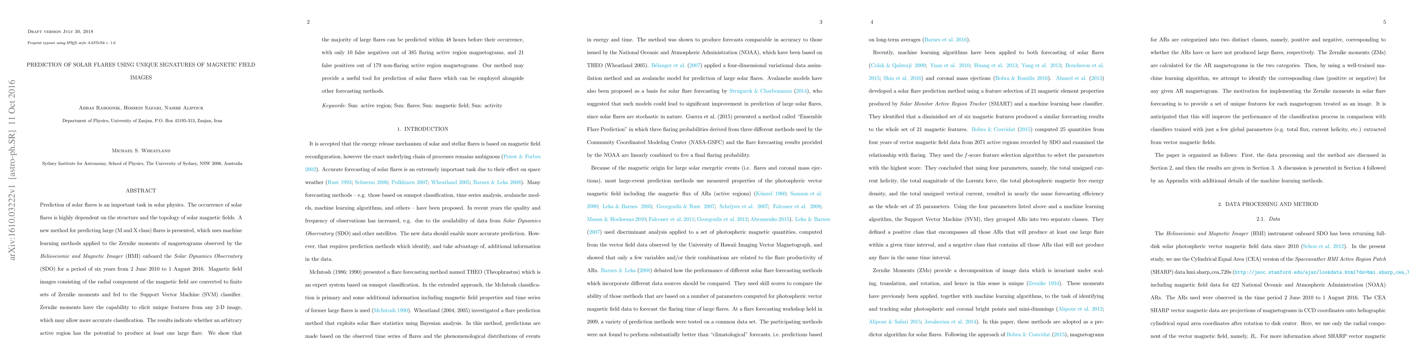 This paper introduces a novel machine learning method for predicting large (M and X class) solar flares using Zernike moments of magnetic field images from the HMI/SDO. The SVM classifier applied to these moments shows high accuracy in predicting flares up to 48 hours in advance, with minimal false positives and negatives.