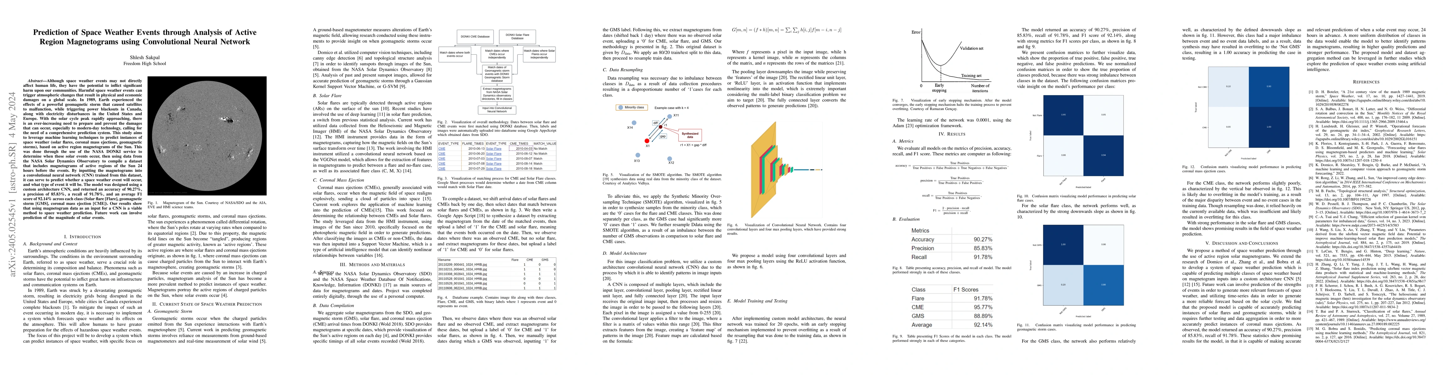 This study uses a convolutional neural network (CNN) to predict space weather events like solar flares and geomagnetic storms based on magnetograms of active regions from the Sun. The model achieved high accuracy (90.27%) and promising F1 scores, indicating the potential of CNNs for space weather prediction.