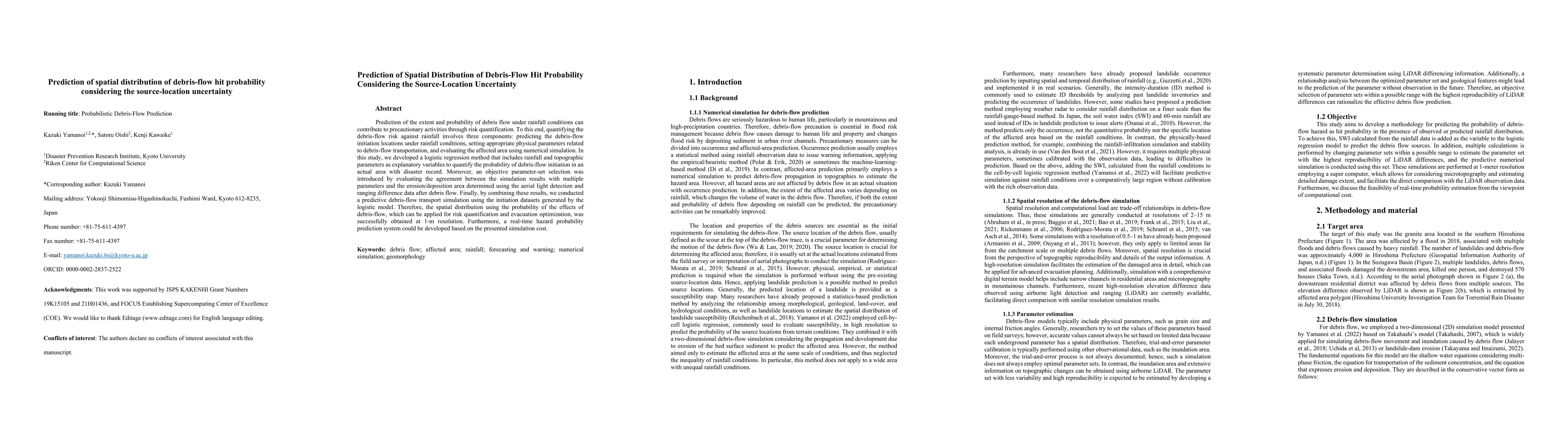 Prediction of the extent and probability of debris flow under rainfall conditions can contribute to precautionary activities through risk quantification. To this end, quantifying the debris-flow risk against rainfall involves three components: predicting the debris-flow initiation locations under rainfall conditions, setting appropriate physical parameters related to debris-flow transportation, and evaluating the affected area using numerical simulation. In this study, we developed a logistic regression method that includes rainfall and topographic parameters as explanatory variables to quantify the probability of debris-flow initiation in an actual area with disaster record. Moreover, an objective parameter-set selection was introduced by evaluating the agreement between the simulation results with multiple parameters and the erosion/deposition area determined using the aerial light detection and ranging difference data after debris flow. Finally, by combining these results, we conducted a predictive debris-flow transport simulation using the initiation datasets generated by the logistic model. Therefore, the spatial distribution using the probability of the effects of debris-flow, which can be applied for risk quantification and evacuation optimization, was successfully obtained at 1-m resolution. Furthermore, a real-time hazard probability prediction system could be developed based on the presented simulation cost.