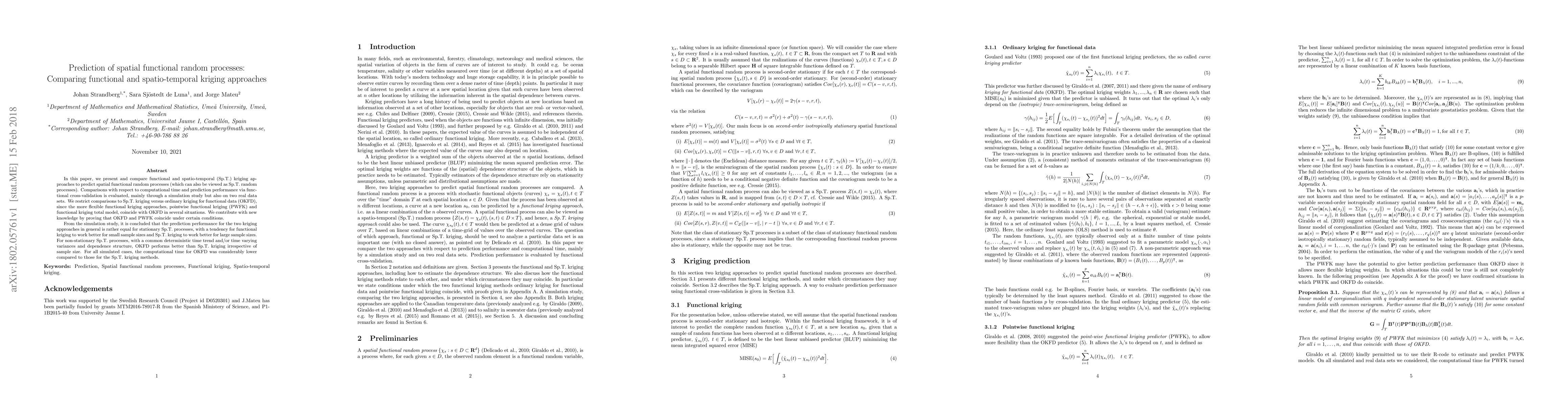 In this paper, we present and compare functional and spatio-temporal (Sp.T.) kriging approaches to predict spatial functional random processes (which can also be viewed as Sp.T. random processes). Comparisons with respect to computational time and prediction performance via functional cross-validation is evaluated, mainly through a simulation study but also on two real data sets. We restrict comparisons to Sp.T. kriging versus ordinary kriging for functional data (OKFD), since the more flexible functional kriging approaches, pointwise functional kriging (PWFK) and functional kriging total model, coincide with OKFD in several situations. We contribute with new knowledge by proving that OKFD and PWFK coincide under certain conditions. From the simulation study, it is concluded that the prediction performance for the two kriging approaches in general is rather equal for stationary Sp.T. processes, with a tendency for functional kriging to work better for small sample sizes and Sp.T. kriging to work better for large sample sizes. For non-stationary Sp.T. processes, with a common deterministic time trend and/or time varying variances and dependence structure, OKFD performs better than Sp.T. kriging irrespective of sample size. For all simulated cases, the computational time for OKFD was considerably lower compared to those for the Sp.T. kriging methods.