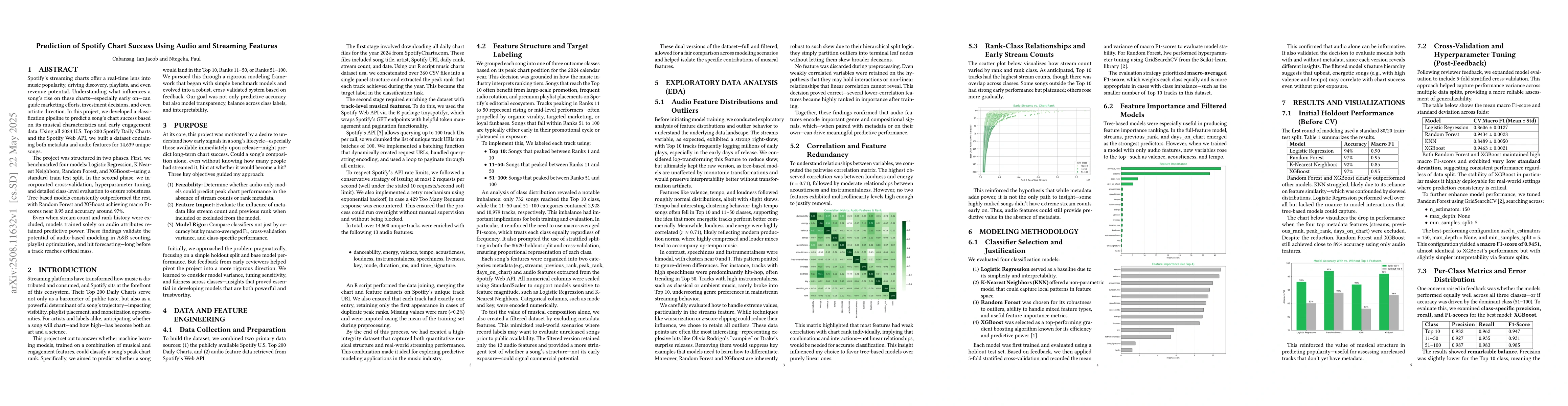Spotify's streaming charts offer a real-time lens into music popularity, driving discovery, playlists, and even revenue potential. Understanding what influences a song's rise in ranks on these charts-especially early on-can guide marketing efforts, investment decisions, and even artistic direction. In this project, we developed a classification pipeline to predict a song's chart success based on its musical characteristics and early engagement data. Using all 2024 U.S. Top 200 Spotify Daily Charts and the Spotify Web API, we built a dataset containing both metadata and audio features for 14,639 unique songs. The project was structured in two phases. First, we benchmarked four models: Logistic Regression, K Nearest Neighbors, Random Forest, and XGBoost-using a standard train-test split. In the second phase, we incorporated cross-validation, hyperparameter tuning, and detailed class-level evaluation to ensure robustness. Tree-based models consistently outperformed the rest, with Random Forest and XGBoost achieving macro F1-scores near 0.95 and accuracy around 97%. Even when stream count and rank history were excluded, models trained solely on audio attributes retained predictive power. These findings validate the potential of audio-based modeling in A&R scouting, playlist optimization, and hit forecasting-long before a track reaches critical mass.