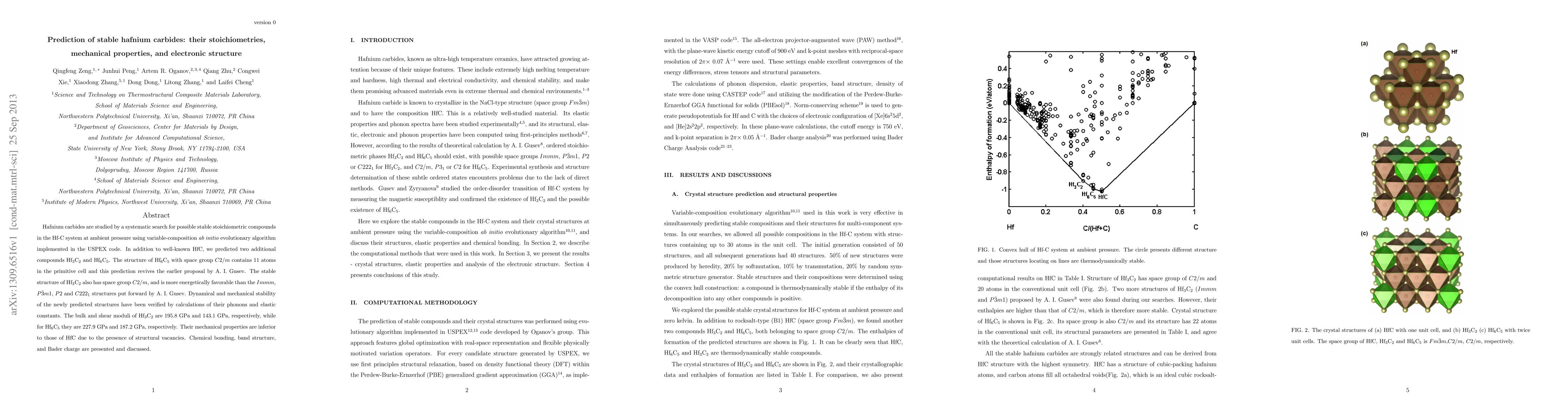 This paper uses an ab initio evolutionary algorithm to predict stable hafnium carbide compounds Hf3C2 and Hf6C5, alongside well-known HfC. The predicted structures are dynamically and mechanically stable, with Hf3C2 and Hf6C5 showing lower bulk and shear moduli compared to HfC due to structural vacancies.