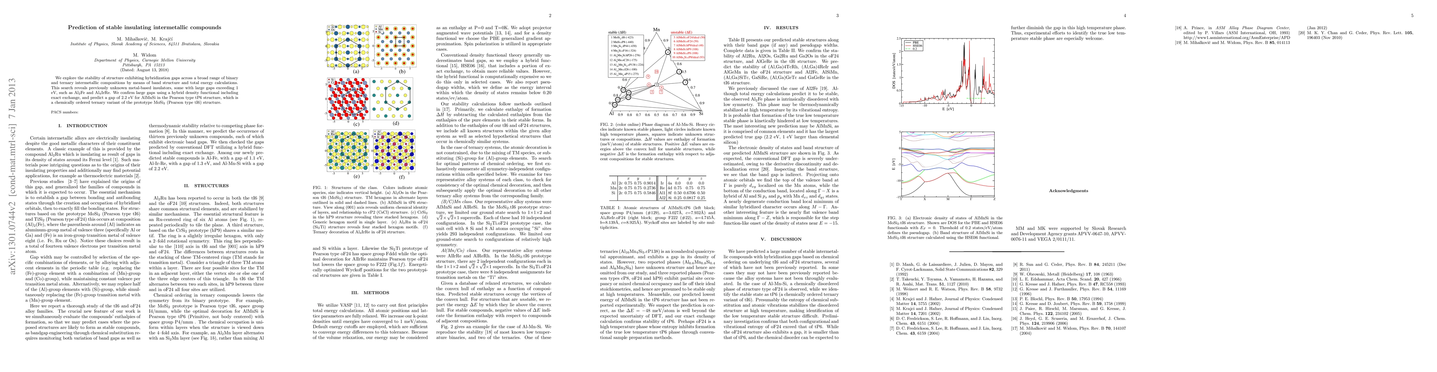We explore the stability of structure exhibiting hybridization gaps across a broad range of binary and ternary intermetallic compositions by means of band structure and total energy calculations. This search reveals previously unknown metal-based insulators, some with large gaps exceeding 1 eV, such as Al2Fe and Al4IrRe. We confirm large gaps using a hybrid density functional including exact exchange, and predict a gap of 2.2 eV for AlMnSi in the Pearson type tP6 structure, which is a chemically ordered ternary variant of the prototype MoSi2 (Pearson type tI6) structure.