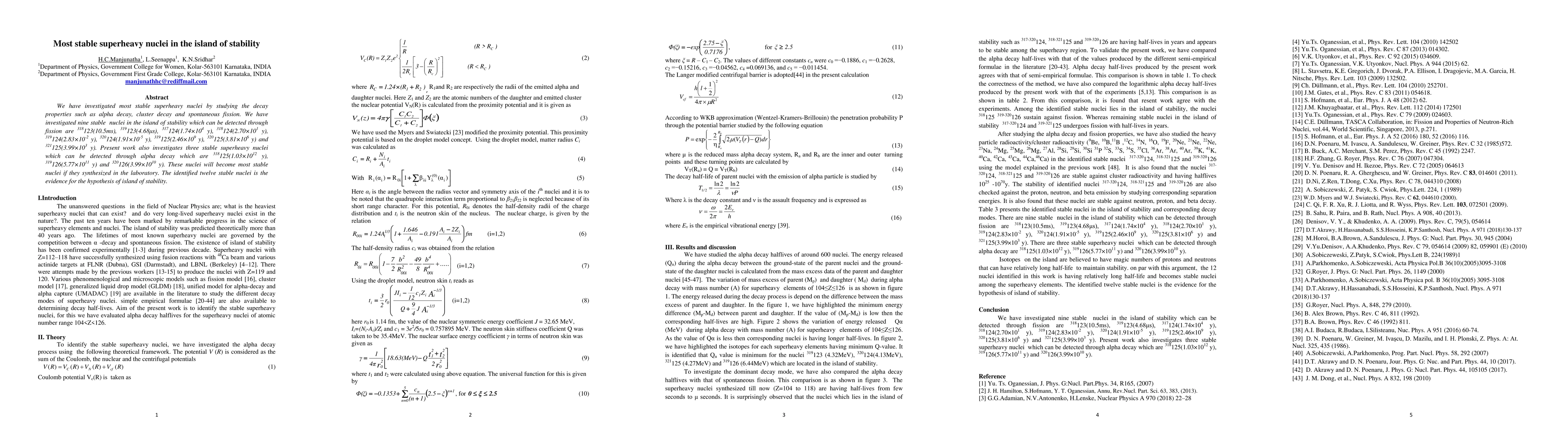 We have investigated most stable superheavy nuclei by studying the decay properties such as alpha decay, cluster decay and spontaneous fission. We have investigated nine stable nuclei in the island of stability which can be detected through fission are 318123(10.5ms), 319123(4.68{\mu}s), 317124(1.74x104 y), 318124(2.70x101 y), 319124(2.83x10-2 y), 320124(1.91x10-5 y), 319125(2.46x109 y), 320125(3.81x106 y) and 321125(3.99x103 y). Present work also investigates three stable superheavy nuclei which can be detected through alpha decay which are 318125(1.03x1012 y), 319126(5.77x1011 y) and 320126(3.99x1010 y). These nuclei will become most stable nuclei if they synthesized in the laboratory. The identified twelve stable nuclei is the evidence for the hypothesis of island of stability