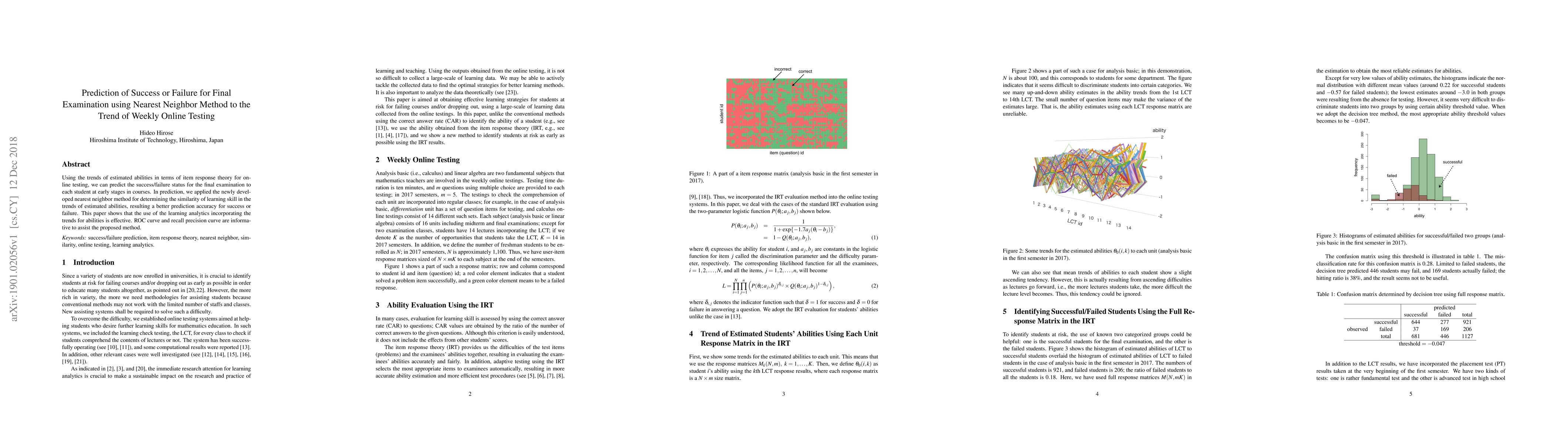 Using the trends of estimated abilities in terms of item response theory for online testing, we can predict the success/failure status for the final examination to each student at early stages in courses. In prediction, we applied the newly developed nearest neighbor method for determining the similarity of learning skill in the trends of estimated abilities, resulting a better prediction accuracy for success or failure. This paper shows that the use of the learning analytics incorporating the trends for abilities is effective. ROC curve and recall precision curve are informative to assist the proposed method.
