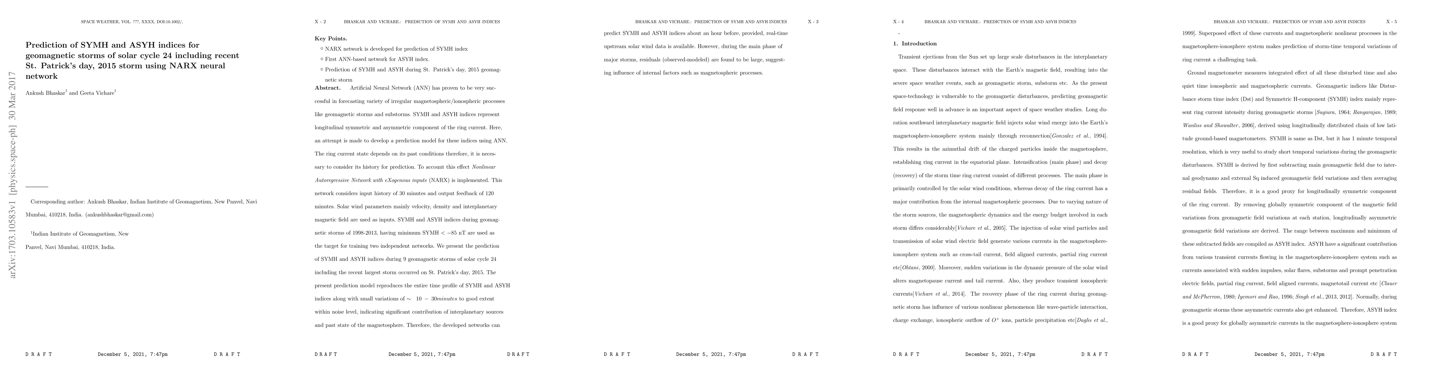 This paper develops a NARX neural network model to predict SYMH and ASYH indices for geomagnetic storms, using solar wind parameters and past ring current conditions. The model successfully forecasts these indices for nine storms in solar cycle 24, with small deviations, indicating the influence of interplanetary sources and past magnetosphere state.