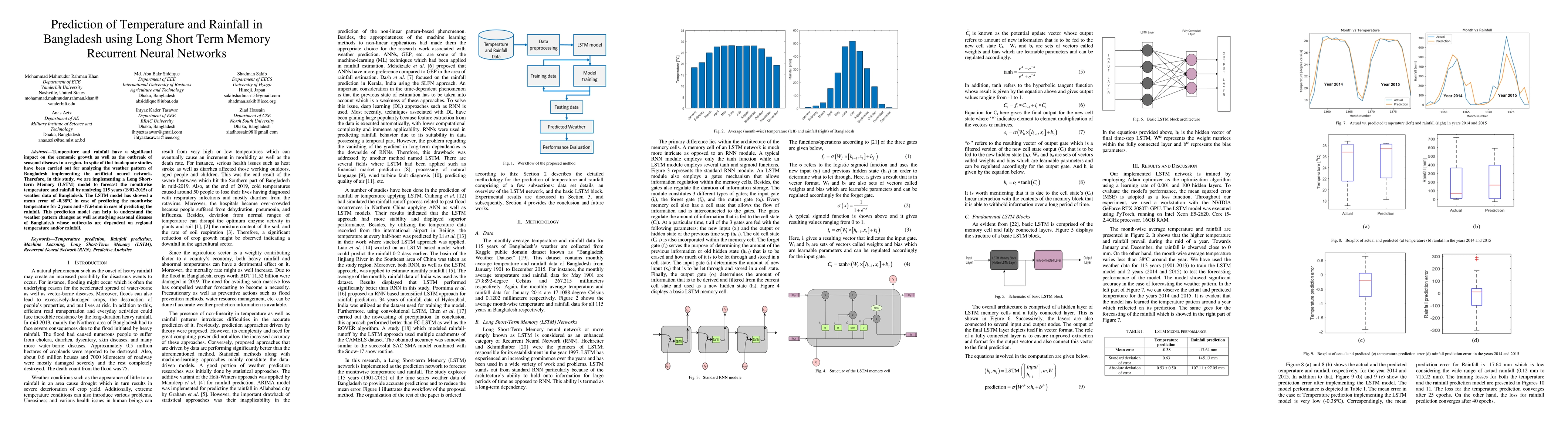Temperature and rainfall have a significant impact on economic growth as well as the outbreak of seasonal diseases in a region. In spite of that inadequate studies have been carried out for analyzing the weather pattern of Bangladesh implementing the artificial neural network. Therefore, in this study, we are implementing a Long Short-term Memory (LSTM) model to forecast the month-wise temperature and rainfall by analyzing 115 years (1901-2015) of weather data of Bangladesh. The LSTM model has shown a mean error of -0.38oC in case of predicting the month-wise temperature for 2 years and -17.64mm in case of predicting the rainfall. This prediction model can help to understand the weather pattern changes as well as studying seasonal diseases of Bangladesh whose outbreaks are dependent on regional temperature and/or rainfall.