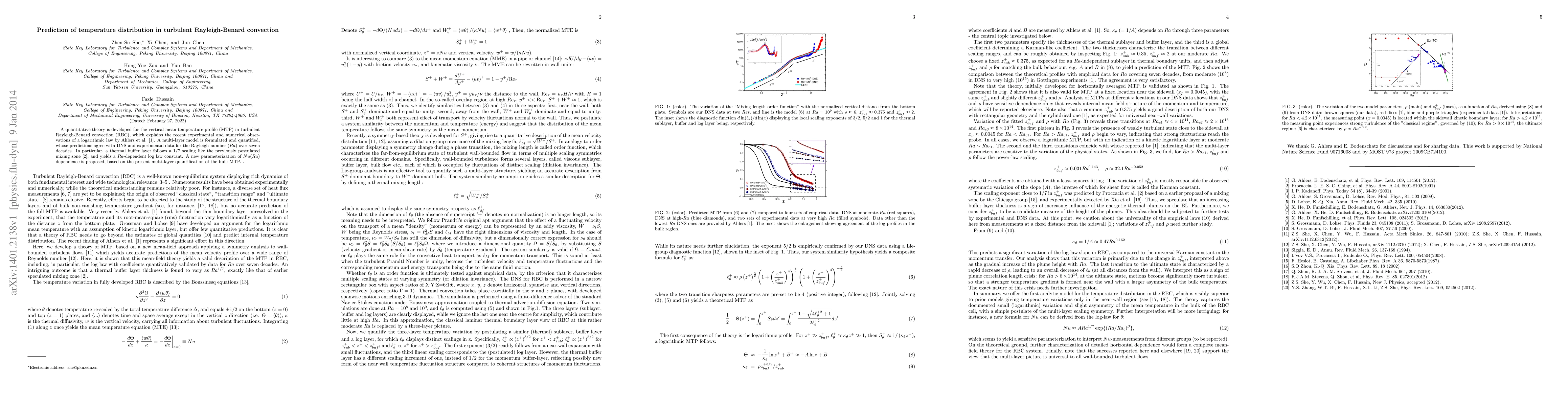 A quantitative theory is developed for the vertical mean temperature profile (MTP) in turbulent Rayleigh-Benard convection (RBC), which explains the recent experimental and numerical observations of a logarithmic law by Ahlers et al.(Phys. Rev. Lett., 2012). A multi-layer model is formulated and quantified, whose predictions agree with DNS and experimental data for the Rayleigh-number (Ra) over seven decades. In particular, a thermal buffer layer follows a 1/7 scaling like the previously postulated mixing zone (Procaccia et al, Phys. Rev. A,1991), and yields a Ra-dependent log law constant. A new parameterization of Nu(Ra) dependence is proposed, based on the present multi-layer quantification of the bulk MTP.