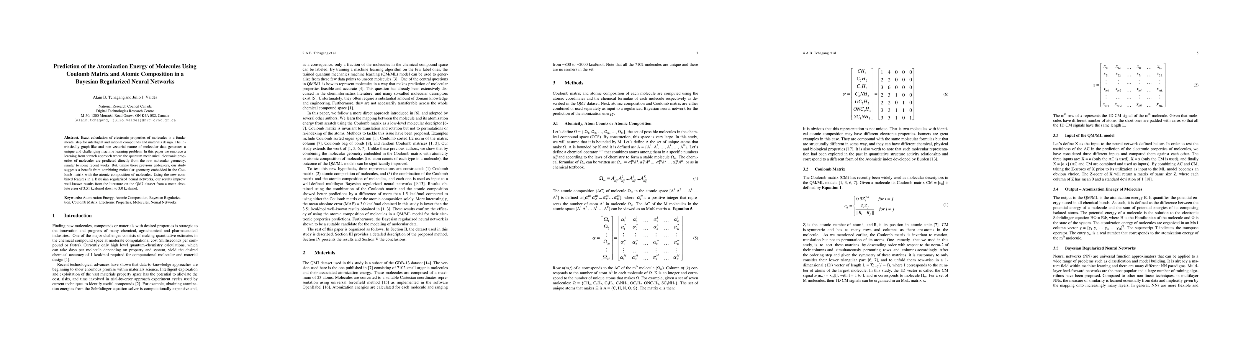 Exact calculation of electronic properties of molecules is a fundamental step for intelligent and rational compounds and materials design. The intrinsically graph-like and non-vectorial nature of molecular data generates a unique and challenging machine learning problem. In this paper we embrace a learning from scratch approach where the quantum mechanical electronic properties of molecules are predicted directly from the raw molecular geometry, similar to some recent works. But, unlike these previous endeavors, our study suggests a benefit from combining molecular geometry embedded in the Coulomb matrix with the atomic composition of molecules. Using the new combined features in a Bayesian regularized neural networks, our results improve well-known results from the literature on the QM7 dataset from a mean absolute error of 3.51 kcal/mol down to 3.0 kcal/mol.