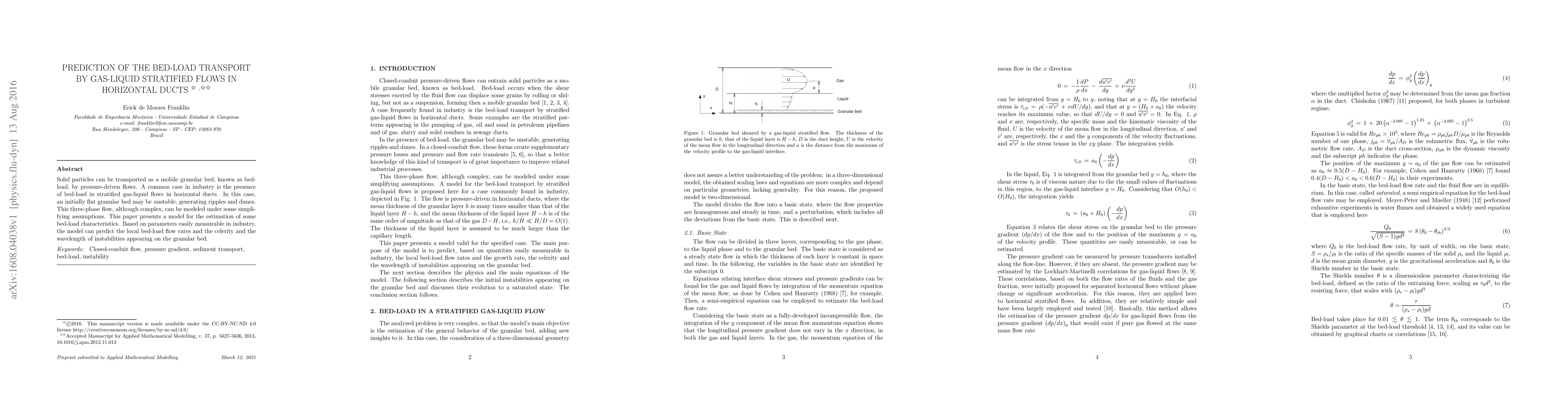 Solid particles can be transported as a mobile granular bed, known as bed-load, by pressure-driven flows. A common case in industry is the presence of bed-load in stratified gas-liquid flows in horizontal ducts. In this case, an initially flat granular bed may be unstable, generating ripples and dunes. This three-phase flow, although complex, can be modeled under some simplifying assumptions. This paper presents a model for the estimation of some bed-load characteristics. Based on parameters easily measurable in industry, the model can predict the local bed-load flow rates and the celerity and the wavelength of instabilities appearing on the granular bed.