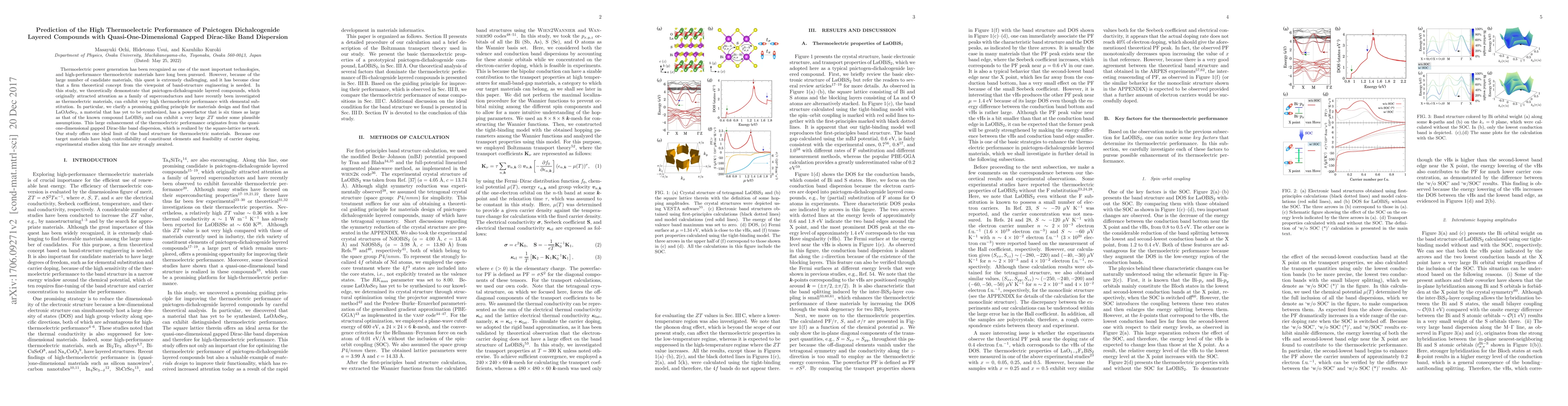 Thermoelectric power generation has been recognized as one of the most important technologies, and high-performance thermoelectric materials have long been pursued. However, because of the large number of candidate materials, this quest is extremely challenging, and it has become clear that a firm theoretical concept from the viewpoint of band-structure engineering is needed. In this study, we theoretically demonstrate that pnictogen-dichalcogenide layered compounds, which originally attracted attention as a family of superconductors and have recently been investigated as thermoelectric materials, can exhibit very high thermoelectric performance with elemental substitution. In particular, we clarify a promising guiding principle for materials design and find that LaOAsSe$_2$, a material that has yet to be synthesized, has a powerfactor that is six times as large as that of the known compound LaOBiS$_2$ and can exhibit a very large $ZT$ under some plausible assumptions. This large enhancement of the thermoelectric performance originates from the quasi-one-dimensional gapped Dirac-like band dispersion, which is realized by the square-lattice network. Our study offers one ideal limit of the band structure for thermoelectric materials. Because our target materials have high controllability of constituent elements and feasibility of carrier doping, experimental studies along this line are strongly awaited.