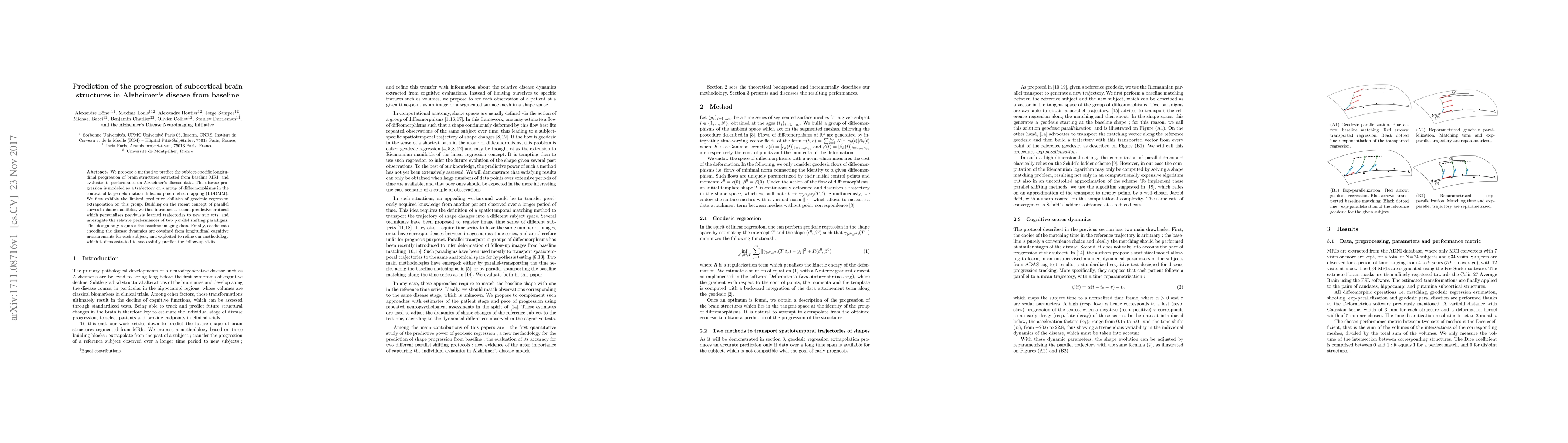 We propose a method to predict the subject-specific longitudinal progression of brain structures extracted from baseline MRI, and evaluate its performance on Alzheimer's disease data. The disease progression is modeled as a trajectory on a group of diffeomorphisms in the context of large deformation diffeomorphic metric mapping (LDDMM). We first exhibit the limited predictive abilities of geodesic regression extrapolation on this group. Building on the recent concept of parallel curves in shape manifolds, we then introduce a second predictive protocol which personalizes previously learned trajectories to new subjects, and investigate the relative performances of two parallel shifting paradigms. This design only requires the baseline imaging data. Finally, coefficients encoding the disease dynamics are obtained from longitudinal cognitive measurements for each subject, and exploited to refine our methodology which is demonstrated to successfully predict the follow-up visits.