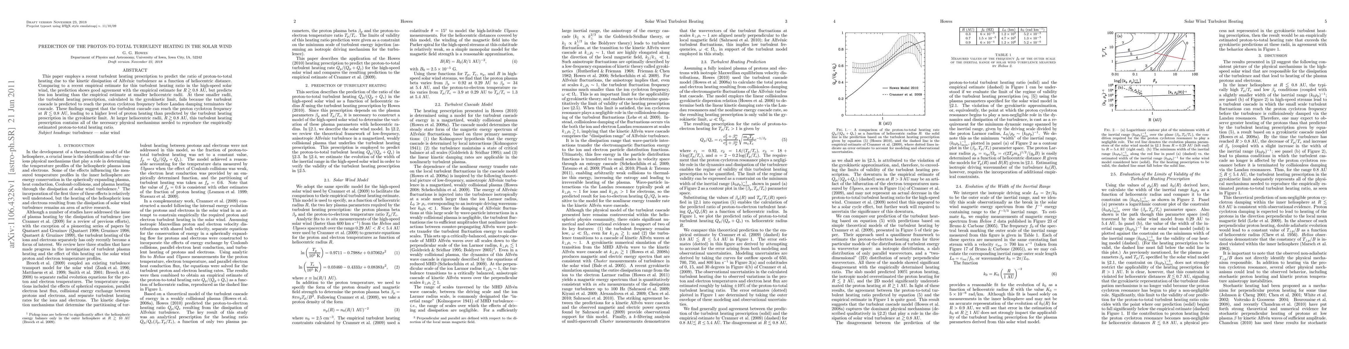 This paper employs a recent turbulent heating prescription to predict the ratio of proton-to-total heating due to the kinetic dissipation of Alfvenic turbulence as a function of heliocentric distance. Comparing to a recent empirical estimate for this turbulent heating ratio in the high-speed solar wind, the prediction shows good agreement with the empirical estimate for R >~ 0.8 AU, but predicts less ion heating than the empirical estimate at smaller heliocentric radii. At these smaller radii, the turbulent heating prescription, calculated in the gyrokinetic limit, fails because the turbulent cascade is predicted to reach the proton cyclotron frequency before Landau damping terminates the cascade. These findings suggest that the turbulent cascade can reach the proton cyclotron frequency at R <~ 0.8 AU, leading to a higher level of proton heating than predicted by the turbulent heating prescription in the gyrokinetic limit. At larger heliocentric radii, R >~ 0.8 AU, this turbulent heating prescription contains all of the necessary physical mechanisms needed to reproduce the empirically estimated proton-to-total heating ratio.