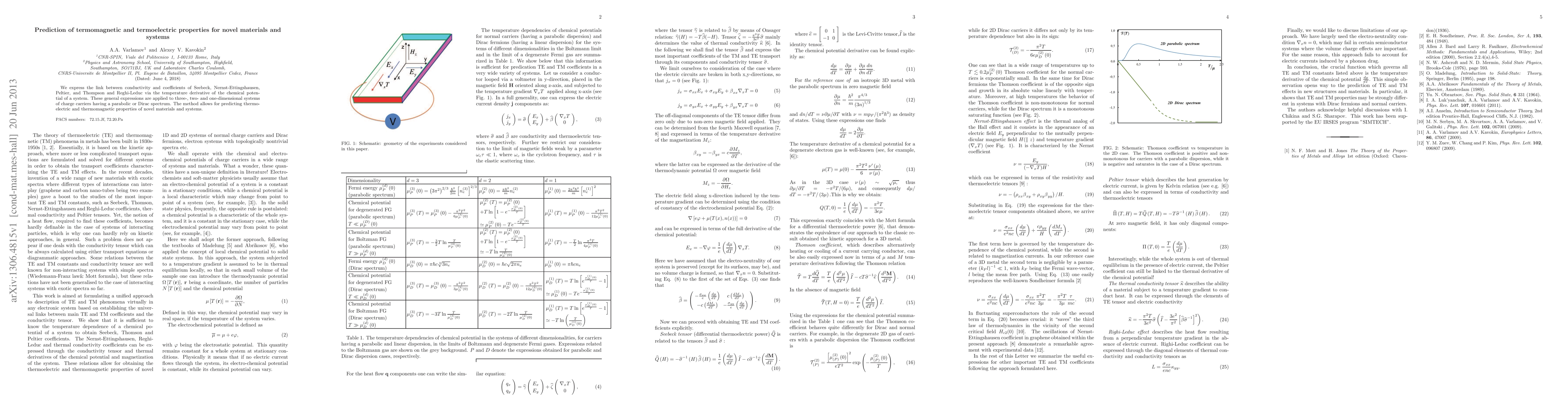 This paper develops a method to predict thermomagnetic and thermoelectric properties by linking conductivity with Seebeck, Nernst-Ettingshausen, Peltier, and Thompson coefficients through the temperature derivative of the chemical potential. It applies this method to various dimensional systems with parabolic or Dirac charge carrier spectra.