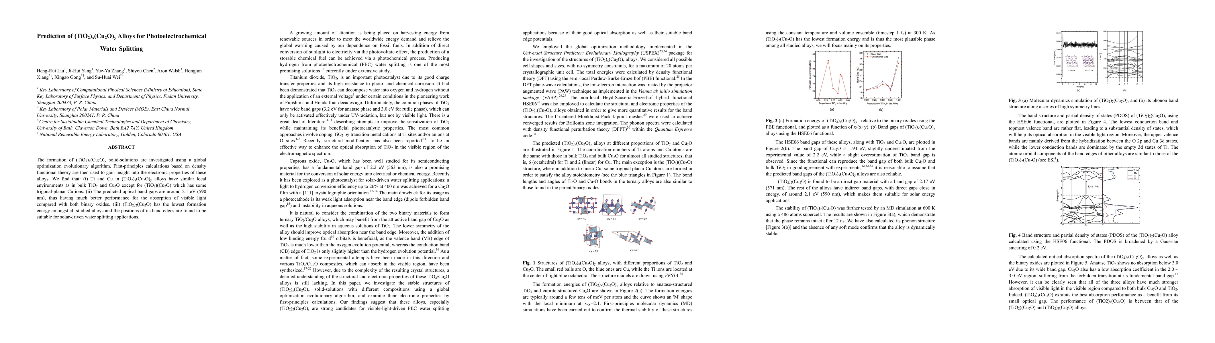 The paper presents a computational approach using USPEX and DFT to predict stable structures and electronic properties of (TiO2)x(Cu2O)y alloys, identifying (TiO2)2(Cu2O) as a promising candidate for solar-driven water splitting.