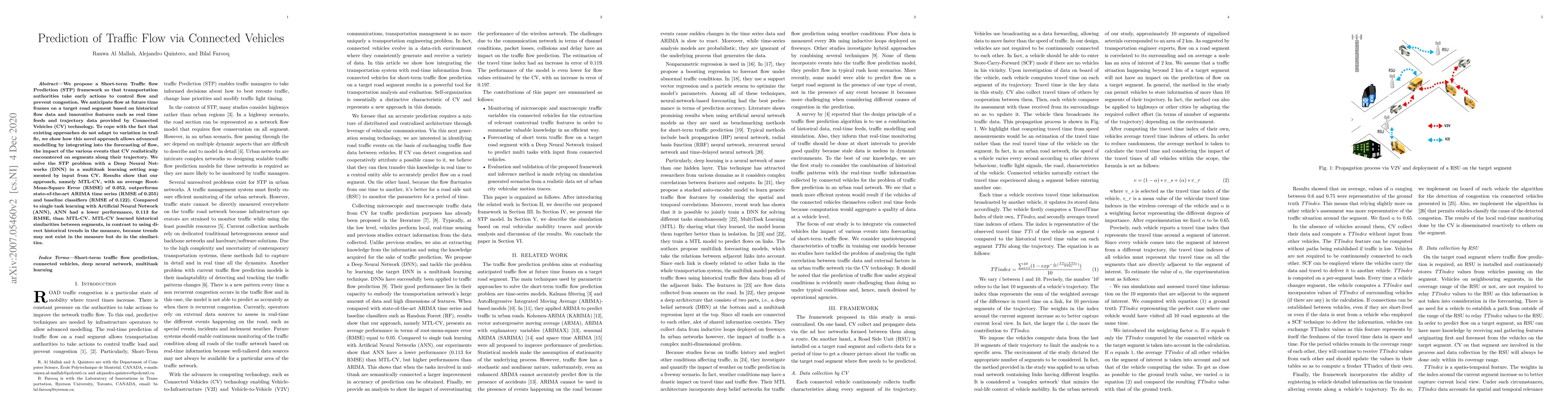 This paper introduces a Short-term Traffic Flow Prediction framework using Connected Vehicles data and Deep Neural Networks, which outperforms traditional ARIMA and baseline classifiers in congestion prevention. The proposed multitask learning approach, MTL-CV, leverages real-time vehicle feeds and trajectory data to better adapt to traffic variations.