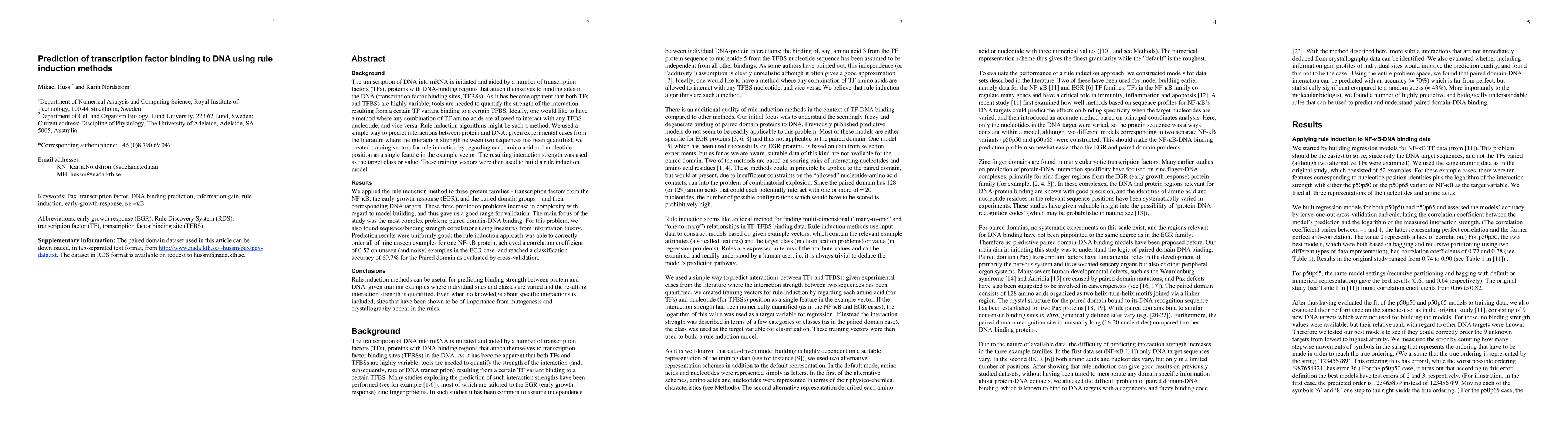 This paper proposes a rule induction method to predict transcription factor binding to DNA, using experimental interaction strength data to train the model. The method was successfully applied to three transcription factor families, showing good prediction performance, especially for the most complex paired domain-DNA binding problem.
