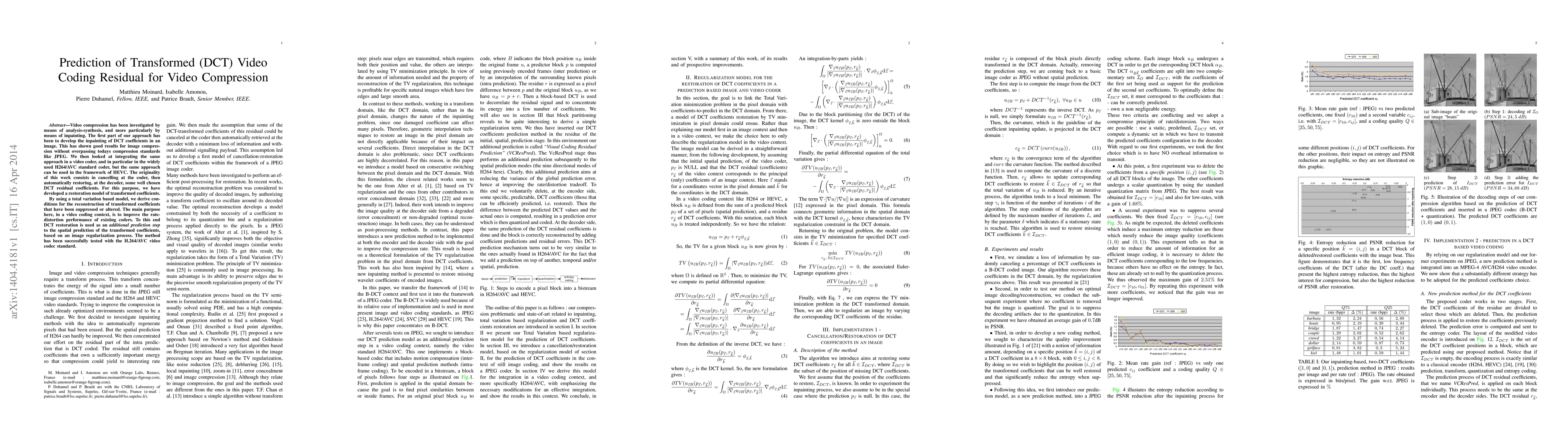 Video compression has been investigated by means of analysis-synthesis, and more particularly by means of inpainting. The first part of our approach has been to develop the inpainting of DCT coefficients in an image. This has shown good results for image compression without overpassing todays compression standards like JPEG. We then looked at integrating the same approach in a video coder, and in particular in the widely used H264 AVC standard coder, but the same approach can be used in the framework of HEVC. The originality of this work consists in cancelling at the coder, then automatically restoring, at the decoder, some well chosen DCT residual coefficients. For this purpose, we have developed a restoration model of transformed coefficients. By using a total variation based model, we derive conditions for the reconstruction of transformed coefficients that have been suppressed or altered. The main purpose here, in a video coding context, is to improve the ratedistortion performance of existing coders. To this end DCT restoration is used as an additional prediction step to the spatial prediction of the transformed coefficients, based on an image regularization process. The method has been successfully tested with the H.264 AVC video codec standard.