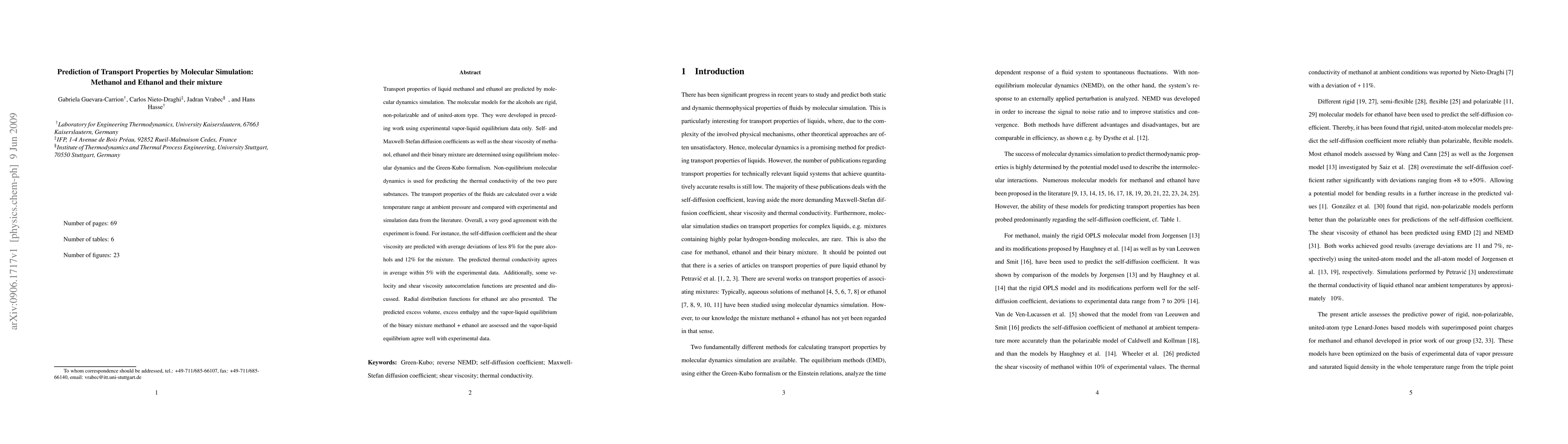 This paper uses molecular dynamics simulations to predict the transport properties of methanol, ethanol, and their mixture, showing good agreement with experimental data. The study determines self-diffusion coefficients, shear viscosity, and thermal conductivity over a wide temperature range, with average deviations less than 8% for pure alcohols and 12% for the mixture.