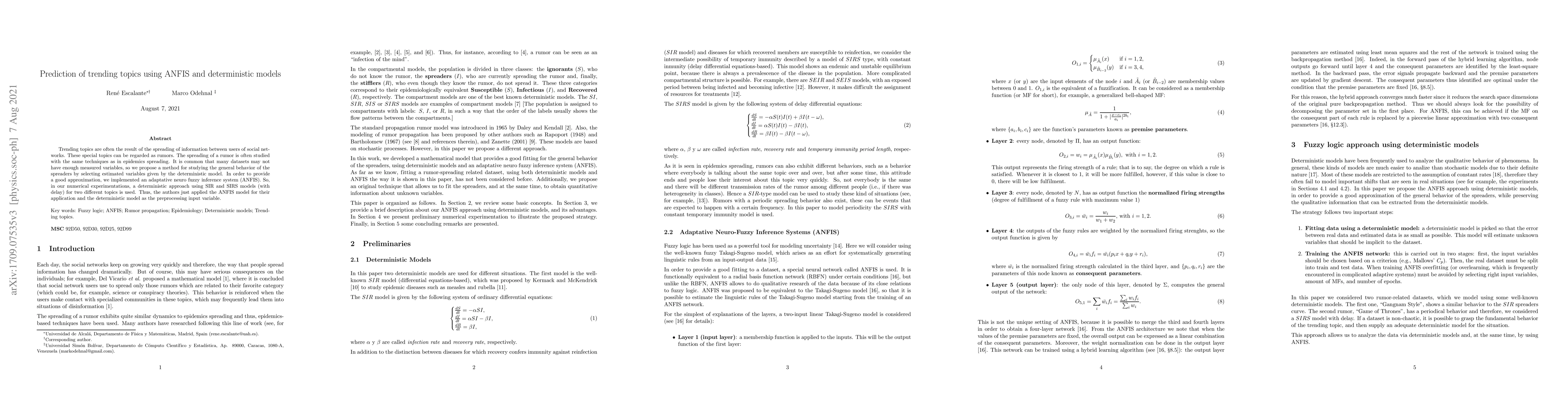 Researchers used ANFIS and deterministic models to predict trending topics on social networks, finding that adaptive neuro fuzzy inference systems can approximate the behavior of spreaders in rumor networks.