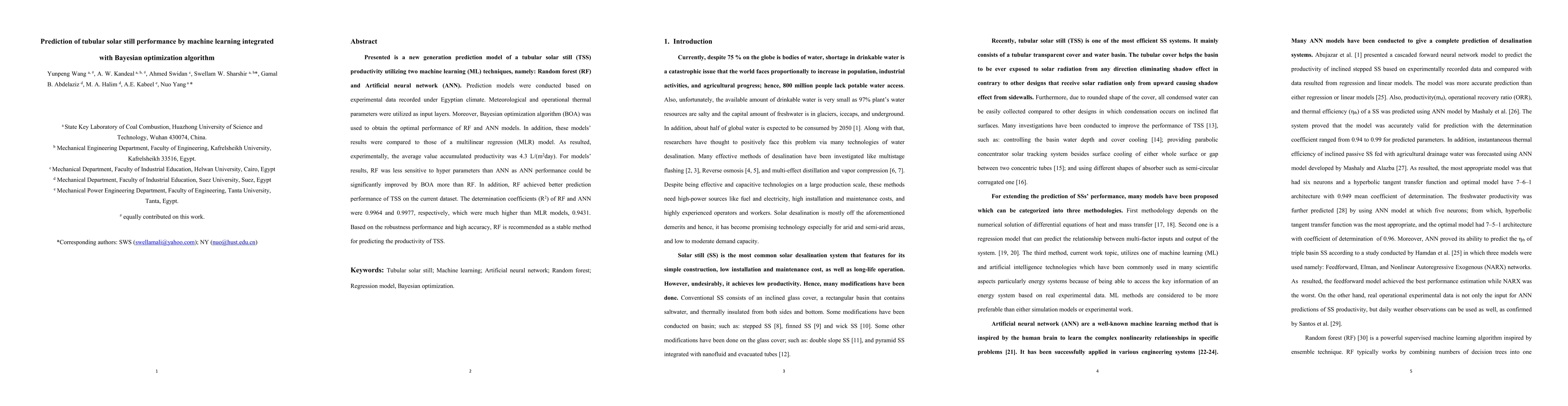 This paper proposes a machine learning model using Random Forest and Artificial Neural Network techniques to predict the performance of tubular solar stills, optimized by a Bayesian optimization algorithm. Results show that Random Forest provides more accurate and stable predictions compared to Artificial Neural Network and multilinear regression models.