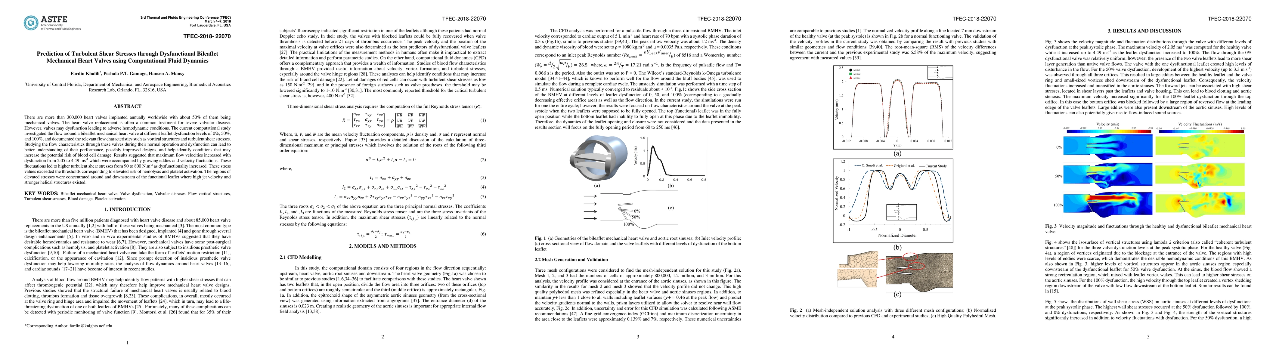 This study uses computational fluid dynamics to predict turbulent shear stresses in dysfunctional bileaflet mechanical heart valves, finding that increased dysfunction correlates with higher flow velocities, eddy formation, and elevated turbulent shear stresses exceeding thresholds for hemolysis and platelet activation.