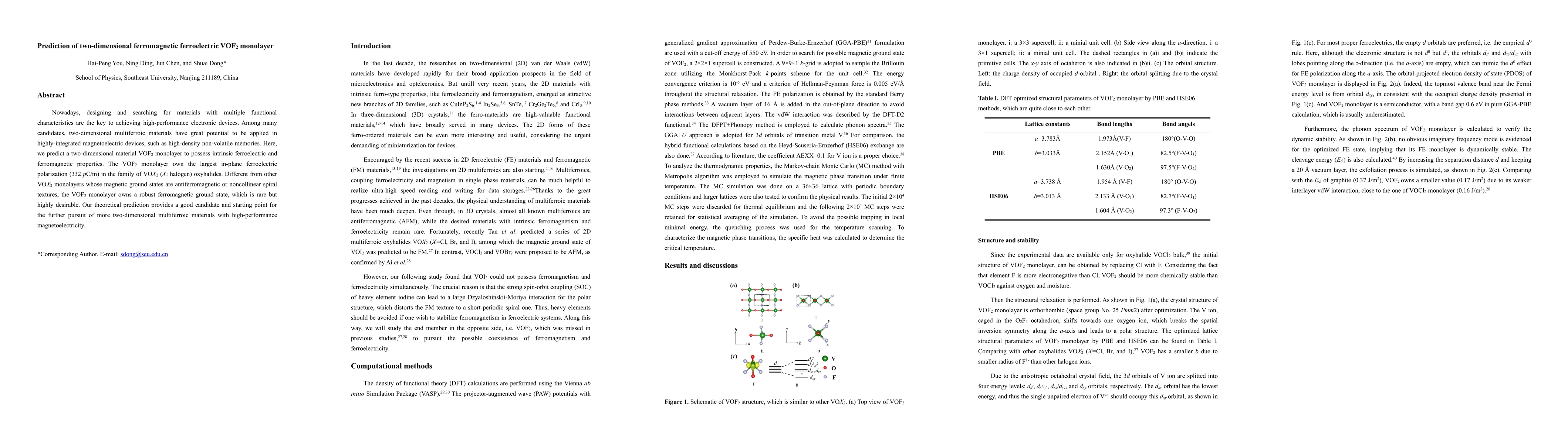Nowadays, designing and searching for materials with multiple functional characteristics are the key to achieving high-performance electronic devices. Among many candidates, two-dimensional multiferroic materials have great potential to be applied in highly-integrated magnetoelectric devices, such as high-density non-volatile memories. Here, we predict a two-dimensional material VOF2 monolayer to possess intrinsic ferroelectric and ferromagnetic properties. The VOF$_2$ monolayer own the largest in-plane ferroelectric polarization ($332$ pC/m) in the family of VO$X_2$ ($X$: halogen) oxyhalides. Different from other VO$X_2$ monolayers whose magnetic ground states are antiferromagnetic or noncollinear spiral textures, the VOF$_2$ monolayer owns a robust ferromagnetic ground state, which is rare but highly desirable. Our theoretical prediction provides a good candidate and starting point for the further pursuit of more two-dimensional multiferroic materials with high-performance magnetoelectricity.