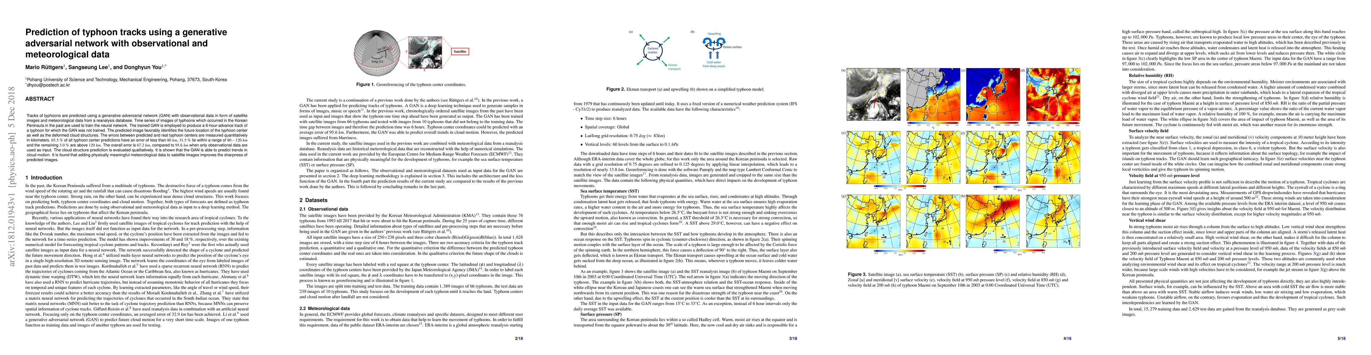 This study uses a generative adversarial network (GAN) trained on satellite images and meteorological data to predict typhoon tracks, achieving a mean error of 67.2 km compared to 95.6 km using observational data alone. The GAN also successfully predicts typhoon cloud structures and trends.