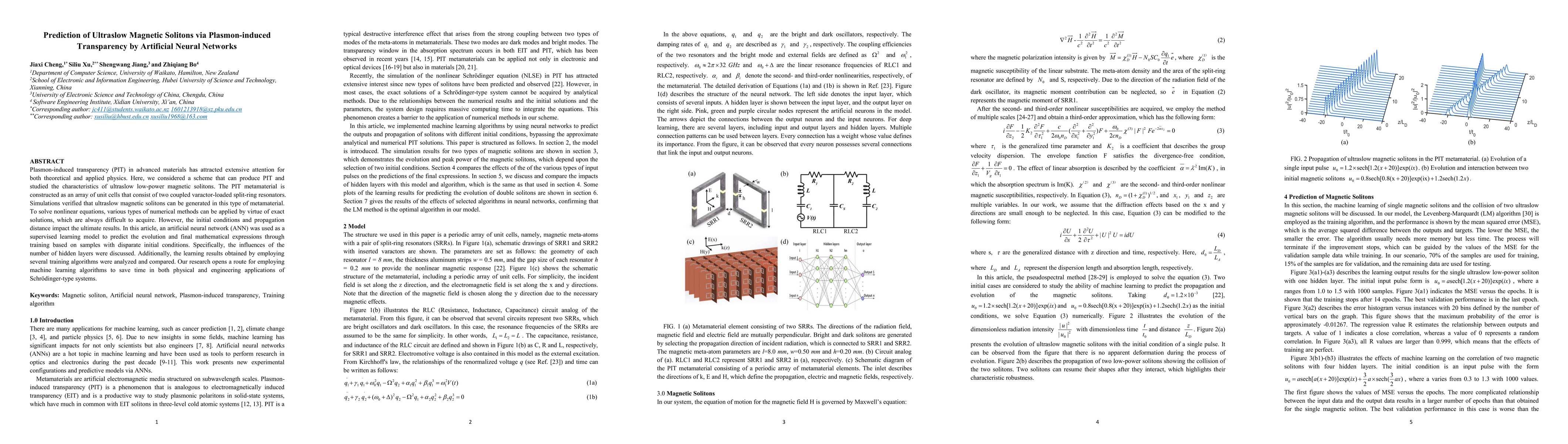 Plasmon-induced transparency (PIT) in advanced materials has attracted extensive attention for both theoretical and applied physics. Here, we considered a scheme that can produce PIT and studied the characteristics of ultraslow low-power magnetic solitons. The PIT metamaterial is constructed as an array of unit cells that consist of two coupled varactor-loaded split-ring resonators. Simulations verified that ultraslow magnetic solitons can be generated in this type of metamaterial. To solve nonlinear equations, various types of numerical methods can be applied by virtue of exact solutions, which are always difficult to acquire. However, the initial conditions and propagation distance impact the ultimate results. In this article, an artificial neural network (ANN) was used as a supervised learning model to predict the evolution and final mathematical expressions through training based on samples with disparate initial conditions. Specifically, the influences of the number of hidden layers were discussed. Additionally, the learning results obtained by employing several training algorithms were analyzed and compared. Our research opens a route for employing machine learning algorithms to save time in both physical and engineering applications of Schr\"odinger-type systems.