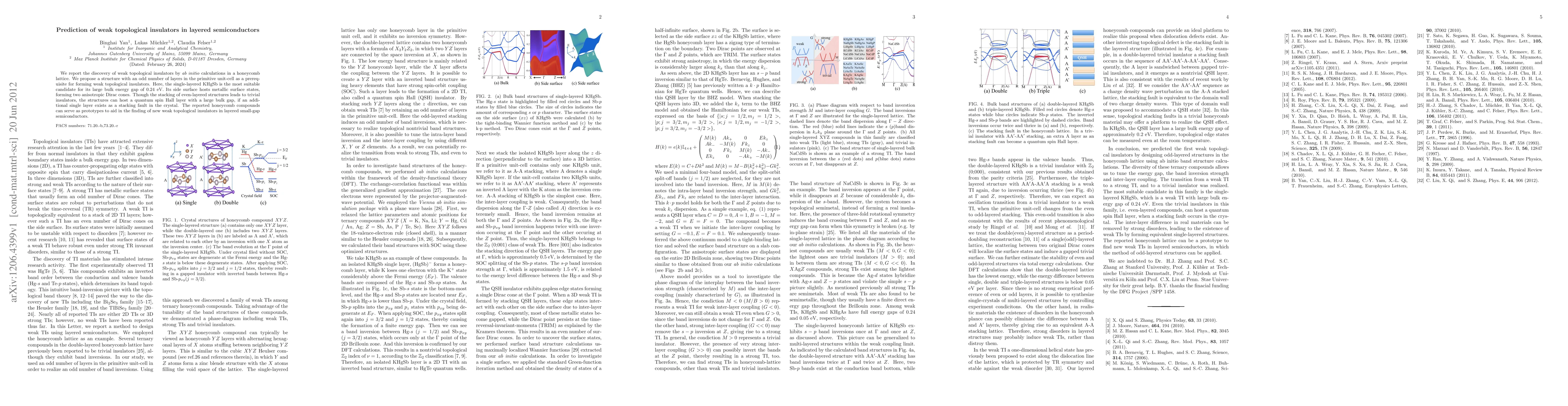 We report the discovery of weak topological insulators by ab initio calculations in a honeycomb lattice. We propose a structure with an odd number of layers in the primitive unit-cell as a prerequisite for forming weak topological insulators. Here, the single-layered KHgSb is the most suitable candidate for its large bulk energy gap of 0.24 eV. Its side surface hosts metallic surface states, forming two anisotropic Dirac cones. Though the stacking of even-layered structures leads to trivial insulators, the structures can host a quantum spin Hall layer with a large bulk gap, if an additional single layer exists as a stacking fault in the crystal. The reported honeycomb compounds can serve as prototypes to aid in the finding of new weak topological insulators in layered small-gap semiconductors.