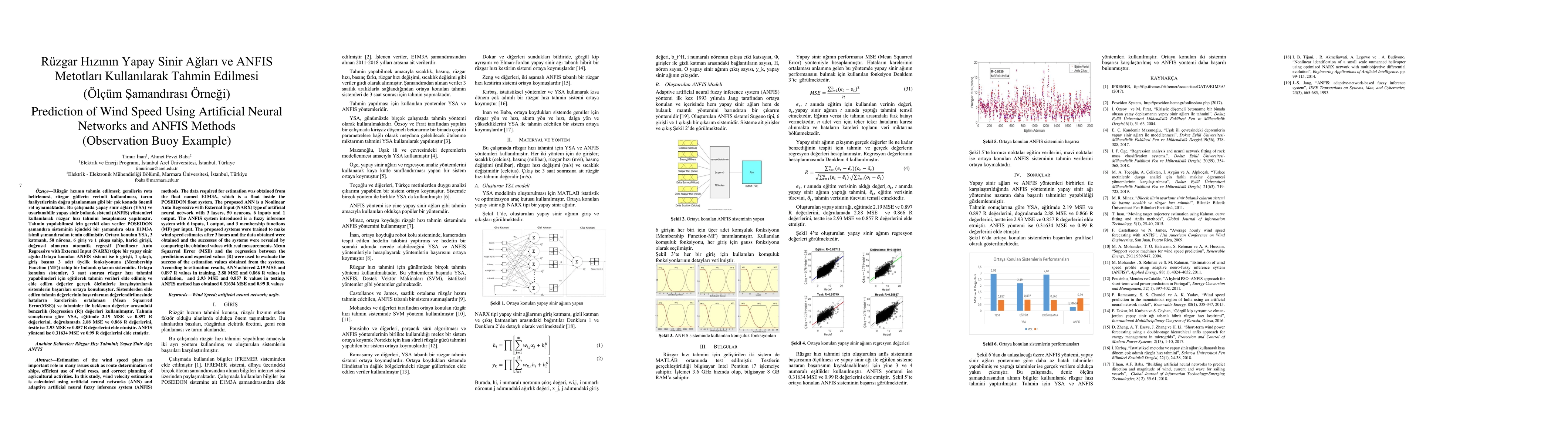 This study estimates wind speed using ANN and ANFIS methods, employing data from the E1M3A buoy. The ANN (NARX type) and ANFIS models were trained to predict wind speed three hours ahead, with evaluation metrics showing ANFIS to outperform ANN in terms of Mean Squared Error and regression accuracy.