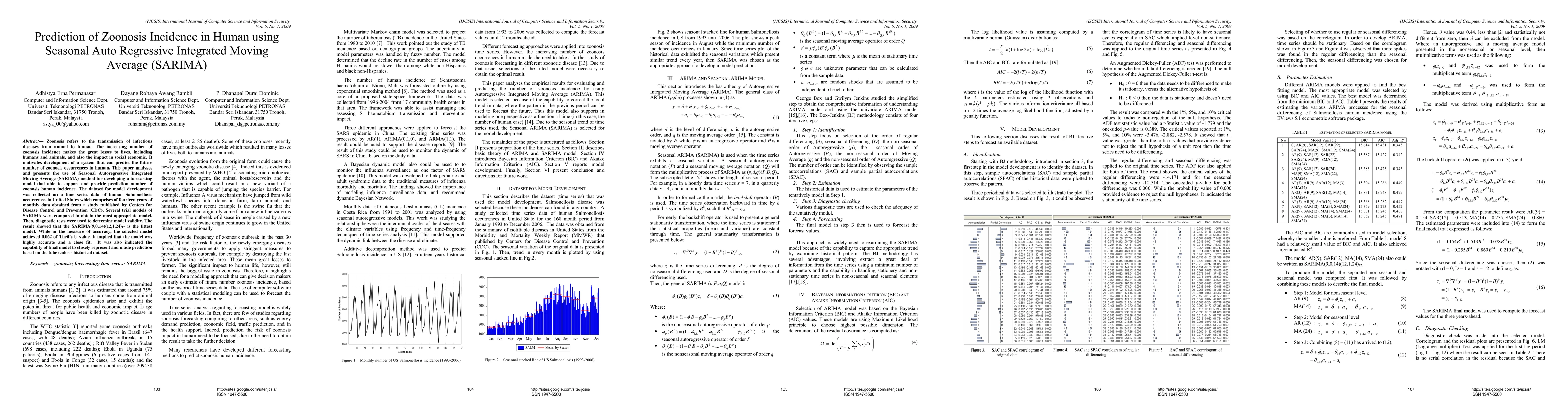 The paper presents a detailed application of the SARIMA method for time series forecasting of zoonotic disease incidence, including model identification, parameter estimation, diagnostic checking, and forecasting.