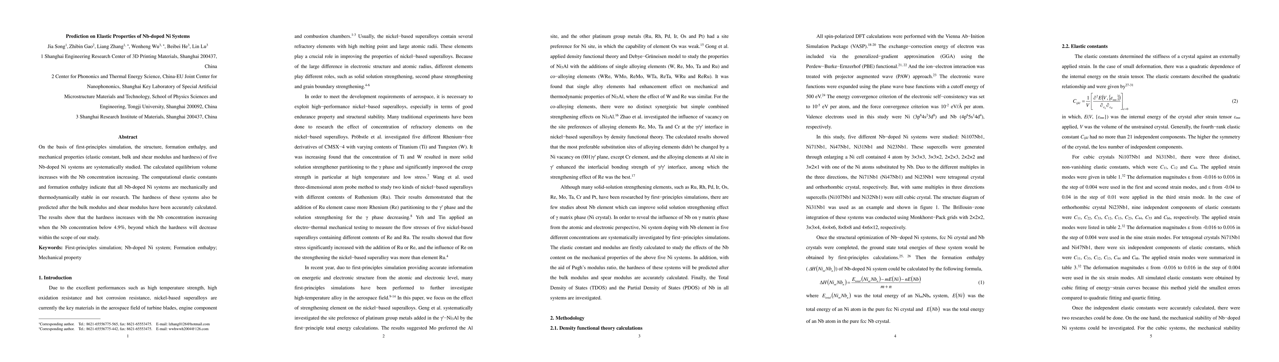 This study uses first-principles simulations to investigate the elastic properties and stability of five Nb-doped Ni systems. Results show that hardness increases with Nb concentration up to 4.9%, after which it decreases, indicating mechanical and thermodynamic stability.