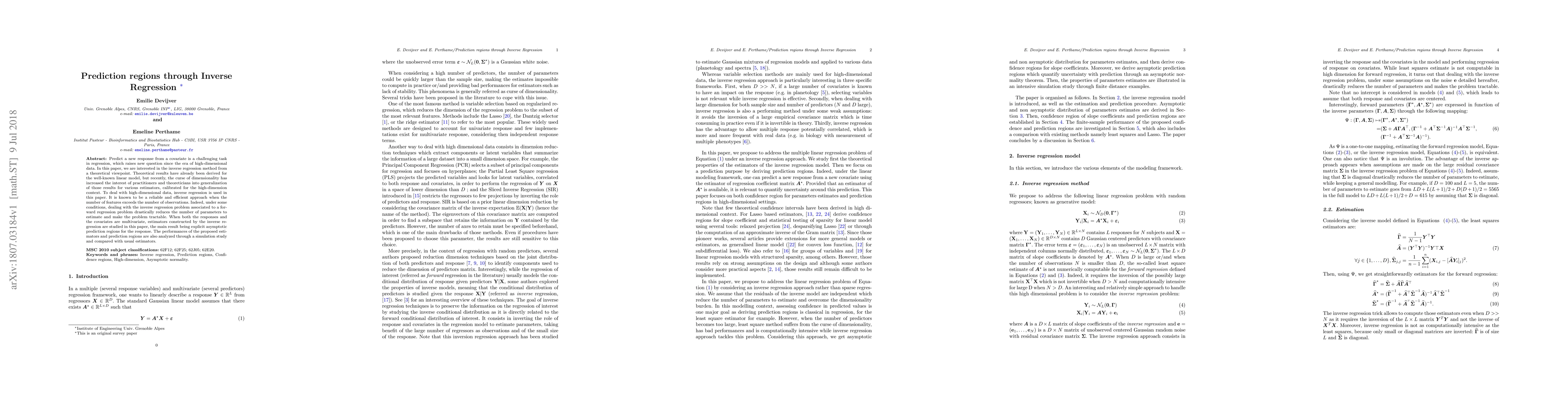 Predict a new response from a covariate is a challenging task in regression, which raises new question since the era of high-dimensional data. In this paper, we are interested in the inverse regression method from a theoretical viewpoint. Theoretical results have already been derived for the well-known linear model, but recently, the curse of dimensionality has increased the interest of practitioners and theoreticians into generalization of those results for various estimators, calibrated for the high-dimension context. To deal with high-dimensional data, inverse regression is used in this paper. It is known to be a reliable and efficient approach when the number of features exceeds the number of observations. Indeed, under some conditions, dealing with the inverse regression problem associated to a forward regression problem drastically reduces the number of parameters to estimate and make the problem tractable. When both the responses and the covariates are multivariate, estimators constructed by the inverse regression are studied in this paper, the main result being explicit asymptotic prediction regions for the response. The performances of the proposed estimators and prediction regions are also analyzed through a simulation study and compared with usual estimators.