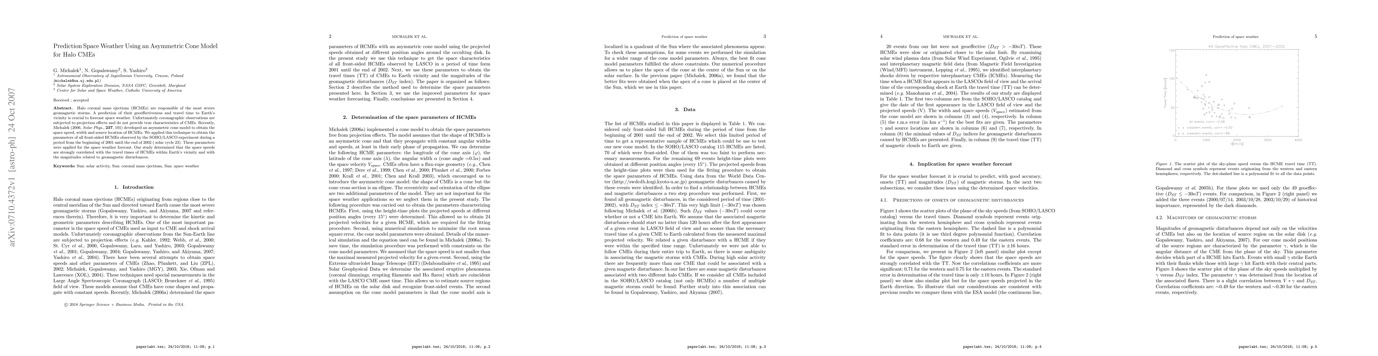 Halo coronal mass ejections (HCMEs) are responsible of the most severe geomagnetic storms. A prediction of their geoeffectiveness and travel time to Earth's vicinity is crucial to forecast space weather. Unfortunately coronagraphic observations are subjected to projection effects and do not provide true characteristics of CMEs. Recently, Michalek (2006, {\it Solar Phys.}, {\bf237}, 101) developed an asymmetric cone model to obtain the space speed, width and source location of HCMEs. We applied this technique to obtain the parameters of all front-sided HCMEs observed by the SOHO/LASCO experiment during a period from the beginning of 2001 until the end of 2002 (solar cycle 23). These parameters were applied for the space weather forecast. Our study determined that the space speeds are strongly correlated with the travel times of HCMEs within Earth's vicinity and with the magnitudes related to geomagnetic disturbances.