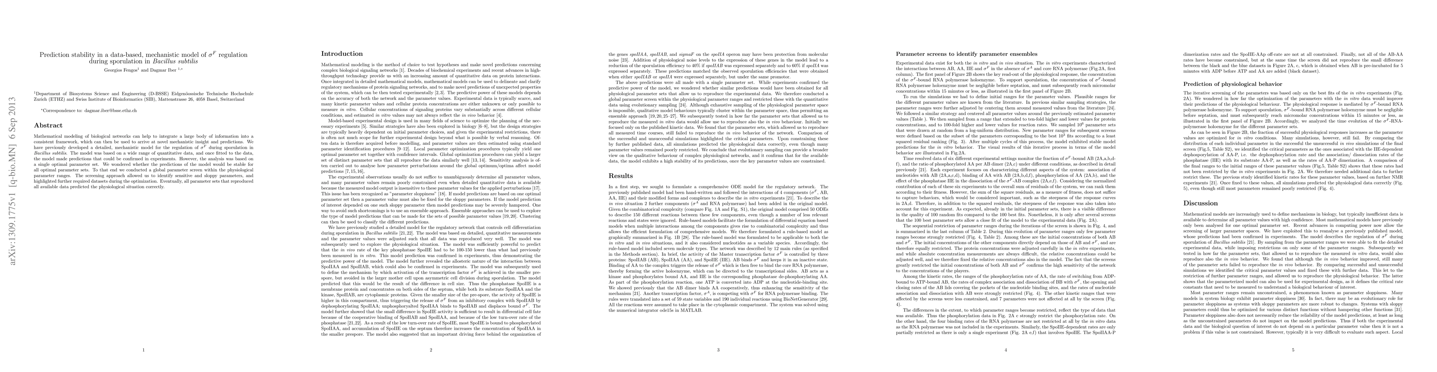 Mathematical modeling of biological networks can help to integrate a large body of information into a consistent framework, which can then be used to arrive at novel mechanistic insight and predictions. We have previously developed a detailed, mechanistic model for the regulation of {\sigma}F during sporulation in Bacillus subtilis. The model was based on a wide range of quantitative data, and once fitted to the data, the model made predictions that could be confirmed in experiments. However, the analysis was based on a single optimal parameter set. We wondered whether the predictions of the model would be stable for all optimal parameter sets. To that end we conducted a global parameter screen within the physiological parameter ranges. The screening approach allowed us to identify sensitive and sloppy parameters, and highlighted further required datasets during the optimization. Eventually, all parameter sets that reproduced all available data predicted the physiological situation correctly.