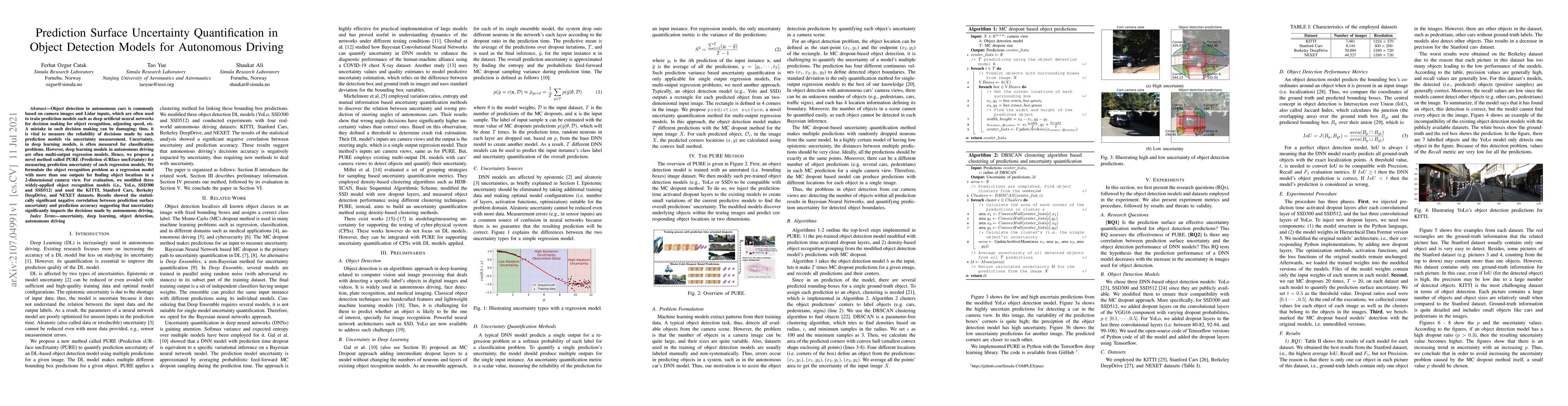 Object detection in autonomous cars is commonly based on camera images and Lidar inputs, which are often used to train prediction models such as deep artificial neural networks for decision making for object recognition, adjusting speed, etc. A mistake in such decision making can be damaging; thus, it is vital to measure the reliability of decisions made by such prediction models via uncertainty measurement. Uncertainty, in deep learning models, is often measured for classification problems. However, deep learning models in autonomous driving are often multi-output regression models. Hence, we propose a novel method called PURE (Prediction sURface uncErtainty) for measuring prediction uncertainty of such regression models. We formulate the object recognition problem as a regression model with more than one outputs for finding object locations in a 2-dimensional camera view. For evaluation, we modified three widely-applied object recognition models (i.e., YoLo, SSD300 and SSD512) and used the KITTI, Stanford Cars, Berkeley DeepDrive, and NEXET datasets. Results showed the statistically significant negative correlation between prediction surface uncertainty and prediction accuracy suggesting that uncertainty significantly impacts the decisions made by autonomous driving.