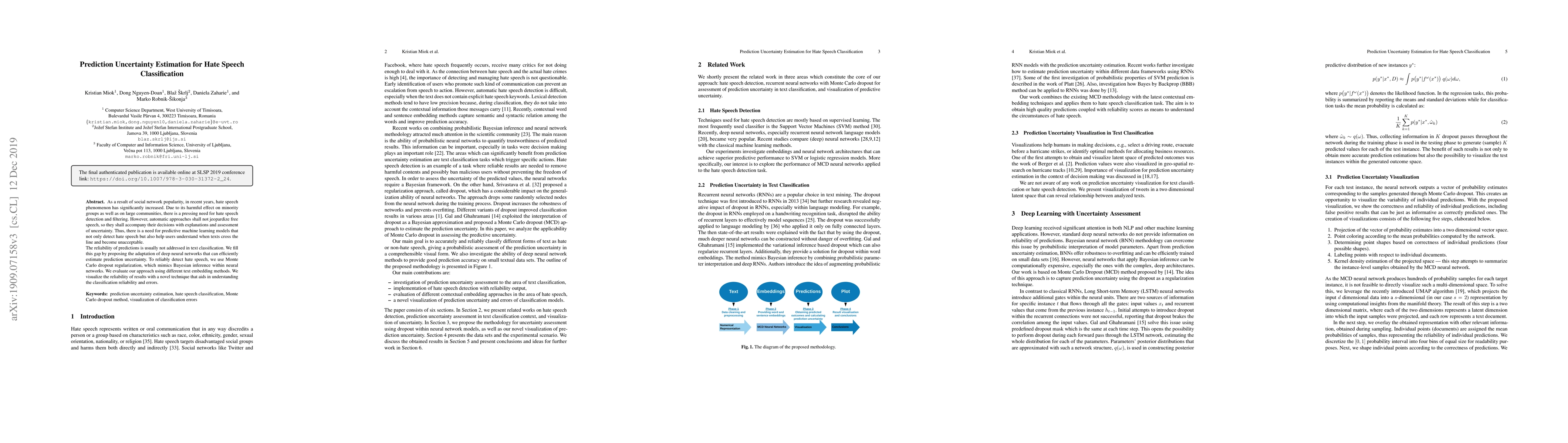 This paper proposes a deep neural network model with Monte Carlo dropout regularization to detect hate speech and estimate prediction uncertainty, ensuring the reliability of its classifications while maintaining transparency. The approach is evaluated using various text embeddings, and a novel visualization technique is introduced to help users understand classification reliability and errors.