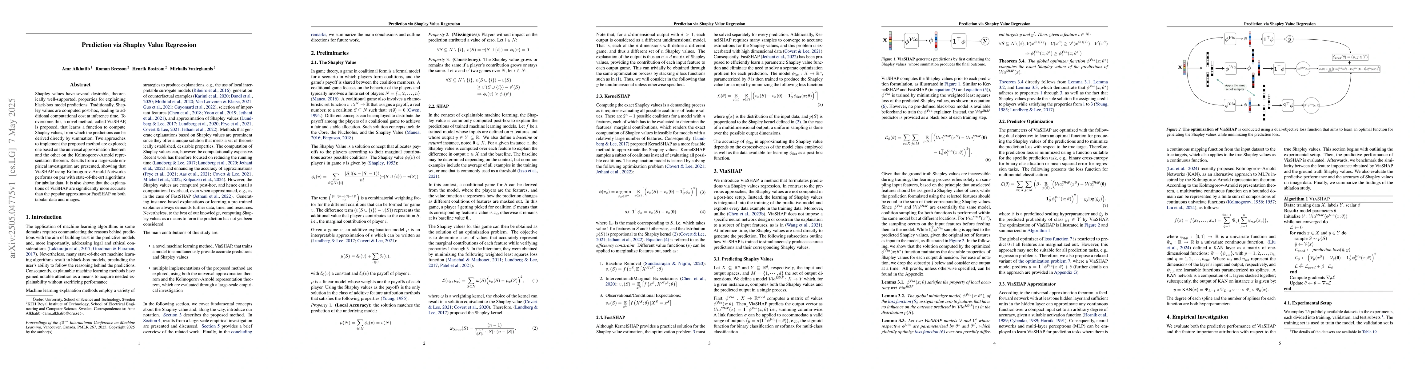 Shapley values have several desirable, theoretically well-supported, properties for explaining black-box model predictions. Traditionally, Shapley values are computed post-hoc, leading to additional computational cost at inference time. To overcome this, a novel method, called ViaSHAP, is proposed, that learns a function to compute Shapley values, from which the predictions can be derived directly by summation. Two approaches to implement the proposed method are explored; one based on the universal approximation theorem and the other on the Kolmogorov-Arnold representation theorem. Results from a large-scale empirical investigation are presented, showing that ViaSHAP using Kolmogorov-Arnold Networks performs on par with state-of-the-art algorithms for tabular data. It is also shown that the explanations of ViaSHAP are significantly more accurate than the popular approximator FastSHAP on both tabular data and images.