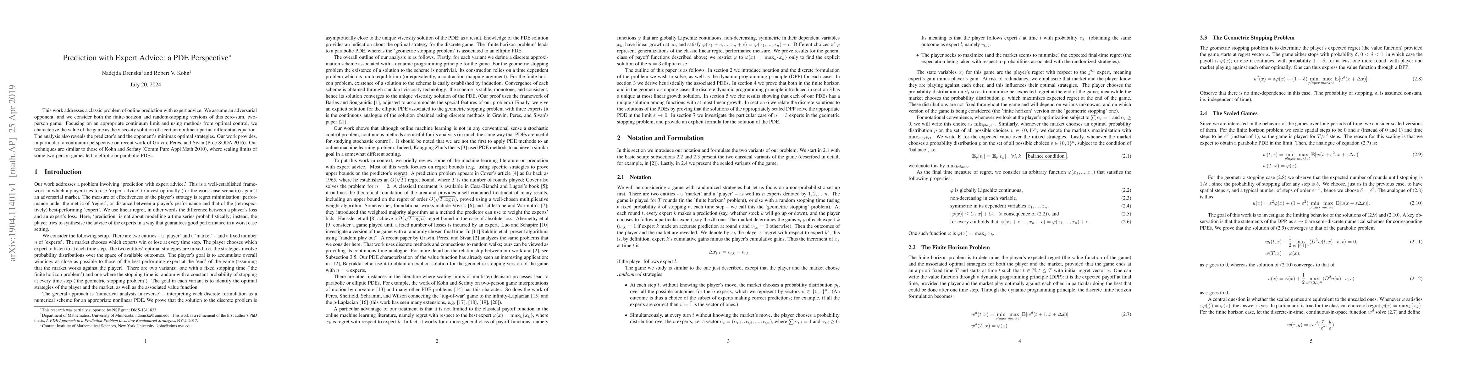 This work addresses a classic problem of online prediction with expert advice. We assume an adversarial opponent, and we consider both the finite-horizon and random-stopping versions of this zero-sum, two-person game. Focusing on an appropriate continuum limit and using methods from optimal control, we characterize the value of the game as the viscosity solution of a certain nonlinear partial differential equation. The analysis also reveals the predictor's and the opponent's minimax optimal strategies. Our work provides, in particular, a continuum perspective on recent work of Gravin, Peres, and Sivan (Proc SODA 2016). Our techniques are similar to those of Kohn and Serfaty (Comm Pure Appl Math 2010), where scaling limits of some two-person games led to elliptic or parabolic PDEs.