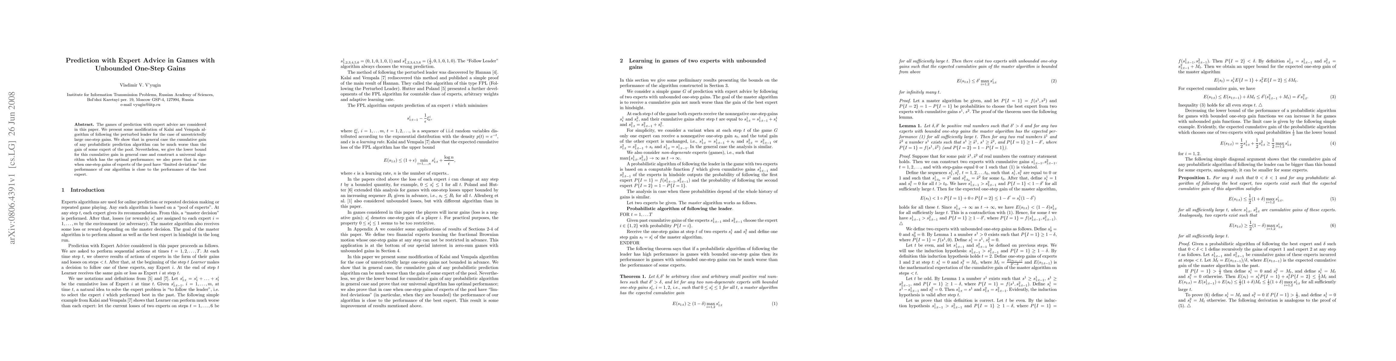 The games of prediction with expert advice are considered in this paper. We present some modification of Kalai and Vempala algorithm of following the perturbed leader for the case of unrestrictedly large one-step gains. We show that in general case the cumulative gain of any probabilistic prediction algorithm can be much worse than the gain of some expert of the pool. Nevertheless, we give the lower bound for this cumulative gain in general case and construct a universal algorithm which has the optimal performance; we also prove that in case when one-step gains of experts of the pool have ``limited deviations'' the performance of our algorithm is close to the performance of the best expert.