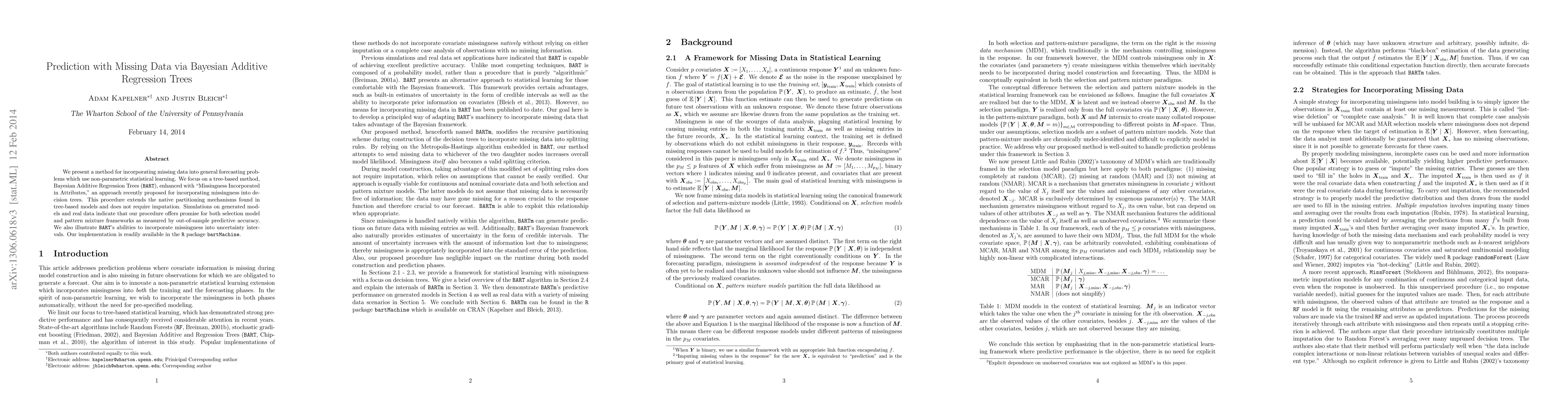 This paper introduces a Bayesian Additive Regression Trees (BART) method for predictive modeling that naturally handles missing data without imputation, leveraging "Missingness Incorporated in Attributes." The approach demonstrates superior predictive performance and stability compared to competitors, especially in complex missing data scenarios.