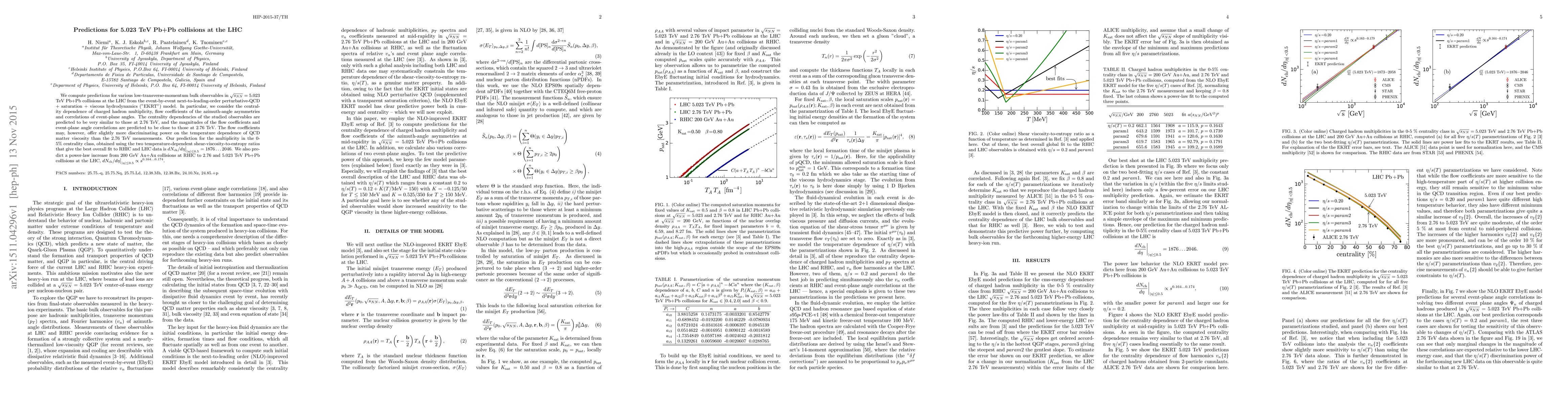 We compute predictions for various low-transverse-momentum bulk observables in $\sqrt{s_{NN}} = 5.023$ TeV Pb+Pb collisions at the LHC from the event-by-event next-to-leading-order perturbative-QCD + saturation + viscous hydrodynamics ("EKRT") model. In particular, we consider the centrality dependence of charged hadron multiplicity, flow coefficients of the azimuth-angle asymmetries and correlations of event-plane angles. The centrality dependencies of the studied observables are predicted to be very similar to those at 2.76 TeV, and the magnitudes of the flow coefficients and event-plane angle correlations are predicted to be close to those at 2.76 TeV. The flow coefficients may, however, offer slightly more discriminating power on the temperature dependence of QCD matter viscosity than the 2.76 TeV measurements. Our prediction for the multiplicity in the 0-5\% centrality class, obtained using the two temperature-dependent shear-viscosity-to-entropy ratios that give the best overall fit to RHIC and LHC data is $dN_{\rm ch}/d\eta\big|_{|\eta|\le 0.5} =1876\dots2046$. We also predict a power-law increase from 200 GeV Au+Au collisions at RHIC to 2.76 and 5.023 TeV Pb+Pb collisions at the LHC, $dN_{\rm ch}/d\eta\big|_{|\eta|\le 0.5} \propto s^{0.164\dots0.174}$.