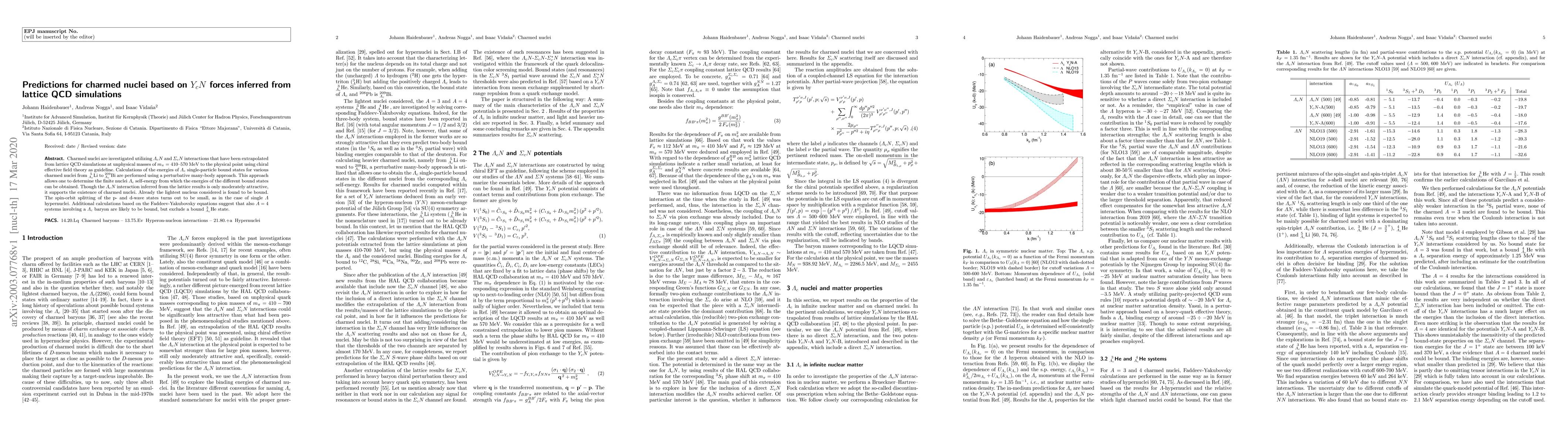 Charmed nuclei are investigated utilizing $\Lambda_c N$ and $\Sigma_c N$ interactions that have been extrapolated from lattice QCD simulations at unphysical masses of $m_\pi = 410$--$570$ MeV to the physical point using chiral effective field theory as guideline. Calculations of the energies of $\Lambda_c$ single-particle bound states for various charmed nuclei from $^{\ 5}_{\Lambda_c}$Li to $^{209}_{\Lambda_c}$Bi are performed using a perturbative many-body approach. This approach allows one to determine the finite nuclei $\Lambda_c$ self-energy from which the energies of the different bound states can be obtained. Though the $\Lambda_c N$ interaction inferred from the lattice results is only moderately attractive, it supports the existence of charmed nuclei. Already the lightest nucleus considered is found to be bound. The spin-orbit splitting of the p- and d-wave states turns out to be small, as in the case of single $\Lambda$ hypernuclei. Additional calculations based on the Faddeev-Yakubovsky equations suggest that also $A=4$ systems involving a $\Lambda_c$ baryon are likely to be bound, but exclude a bound $^{\, 3}_{\Lambda_c}$He state.