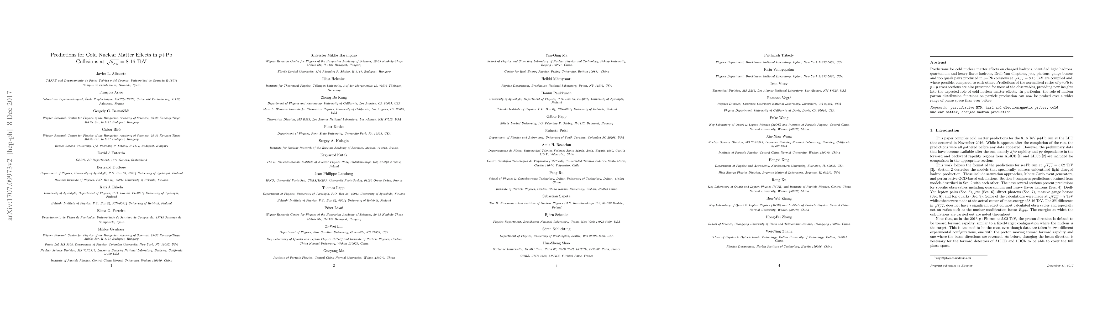 Predictions for cold nuclear matter effects on charged hadrons, identified light hadrons, quarkonium and heavy flavor hadrons, Drell-Yan dileptons, jets, photons, gauge bosons and top quarks produced in $p+$Pb collisions at $\sqrt{s_{_{NN}}} = 8.16$ TeV are compiled and, where possible, compared to each other. Predictions of the normalized ratios of $p+$Pb to $p+p$ cross sections are also presented for most of the observables, providing new insights into the expected role of cold nuclear matter effects. In particular, the role of nuclear parton distribution functions on particle production can now be probed over a wider range of phase space than ever before.