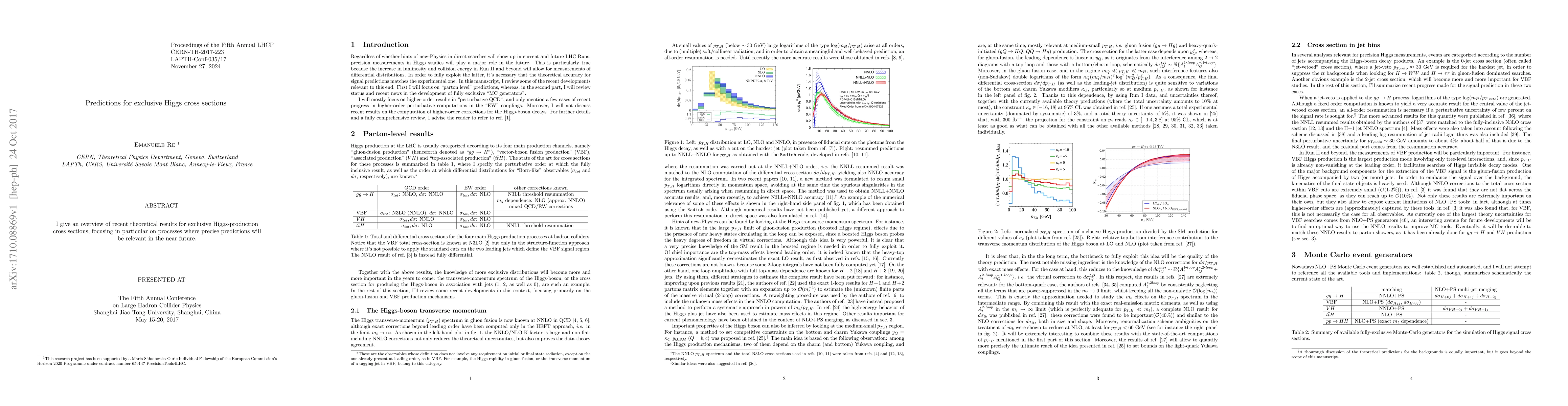 I give an overview of recent theoretical results for exclusive Higgs-production cross sections, focusing in particular on processes where precise predictions will be relevant in the near future.