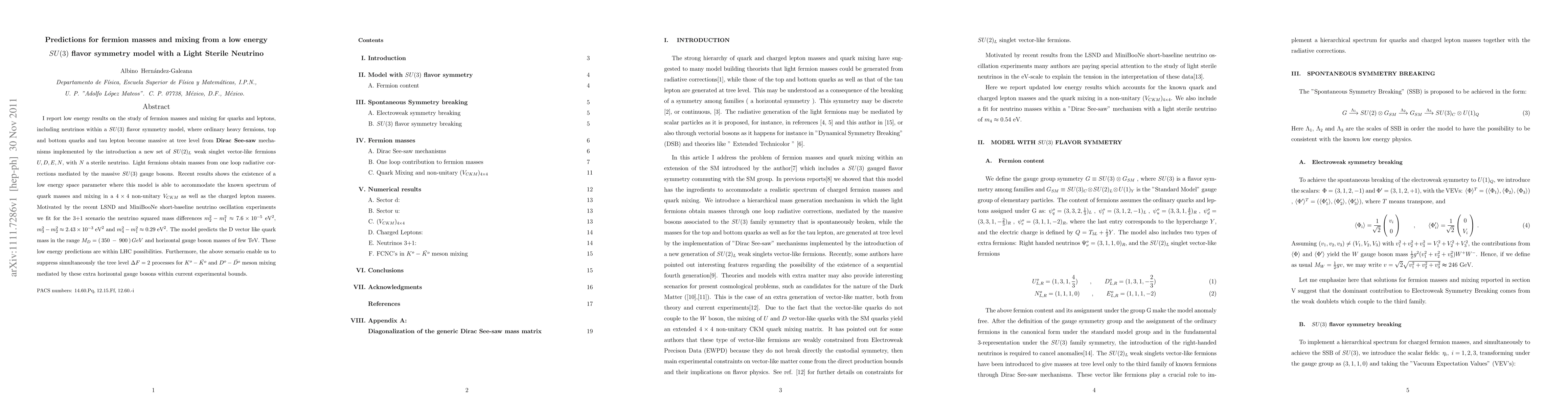 I report low energy results on the study of fermion masses and mixing for quarks and leptons, including neutrinos within a SU(3) flavor symmetry model, where ordinary heavy fermions, top and bottom quarks and tau lepton become massive at tree level from {\bf Dirac See-saw} mechanisms implemented by the introduction a new set of $SU(2)_L$ weak singlet vector-like fermions $U,D,E,N$, with $N$ a sterile neutrino. Light fermions obtain masses from one loop radiative corrections mediated by the massive SU(3) gauge bosons. Recent results shows the existence of a low energy space parameter where this model is able to accommodate the known spectrum of quark masses and mixing in a $4\times 4$ non-unitary $V_{CKM}$ as well as the charged lepton masses. Motivated by the recent LSND and MiniBooNe short-baseline neutrino oscillation experiments we fit for the 3+1 scenario the neutrino squared mass differences $m_2^2 - m_1^2\approx 7.6\times 10^{-5}\;\text{eV}^2$, $m_3^2 - m_2^2\approx 2.43\times 10^{-3} \text{eV}^2$ and $m_4^2 - m_1^2\approx 0.29 \text{eV}^2$. The model predicts the D vector like quark mass in the range $M_D=(350 - 900)GeV$ and horizontal gauge boson masses of few TeV. These low energy predictions are within LHC possibilities. Furthermore, the above scenario enable us to suppress simultaneously the tree level $\Delta F=2$ processes for $K^o-\bar{K^o}$ and $D^o-\bar{D^o}$ meson mixing mediated by these extra horizontal gauge bosons within current experimental bounds.