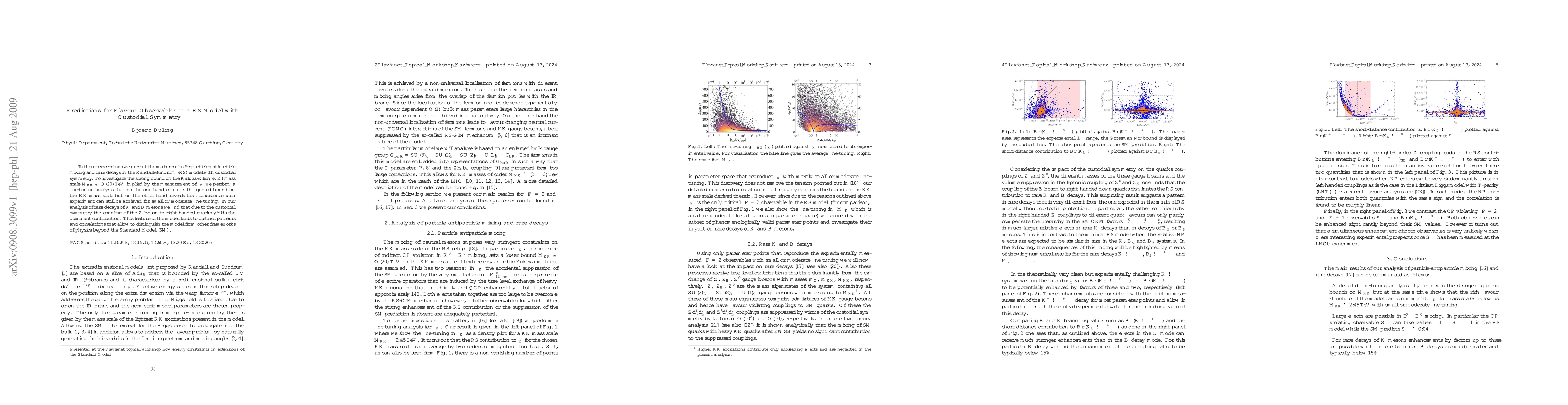 In these proceedings we present the main results for particle-antiparticle mixing and rare decays in the Randall-Sundrum (RS) model with custodial symmetry. To investigate the strong bound on the Kaluza-Klein (KK) mass scale M_KK>O(20)TeV implied by the measurement of epsilon_K we perform a fine-tuning analysis on the one hand confirms the quoted bound on the KK mass scale but on the other hand reveals that consistence with experiment can still be achieved for small or moderate fine-tuning. In our analysis of rare decays of K and B mesons we find that due to the custodial symmetry the coupling of the Z boson to right handed quarks yields the dominant contribution. This feature of the model leads to distinct patterns and correlations that allow to distinguish the model from other frameworks of physics beyond the Standard Model (SM).